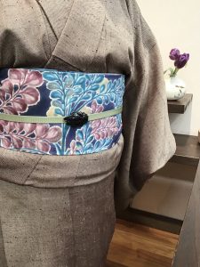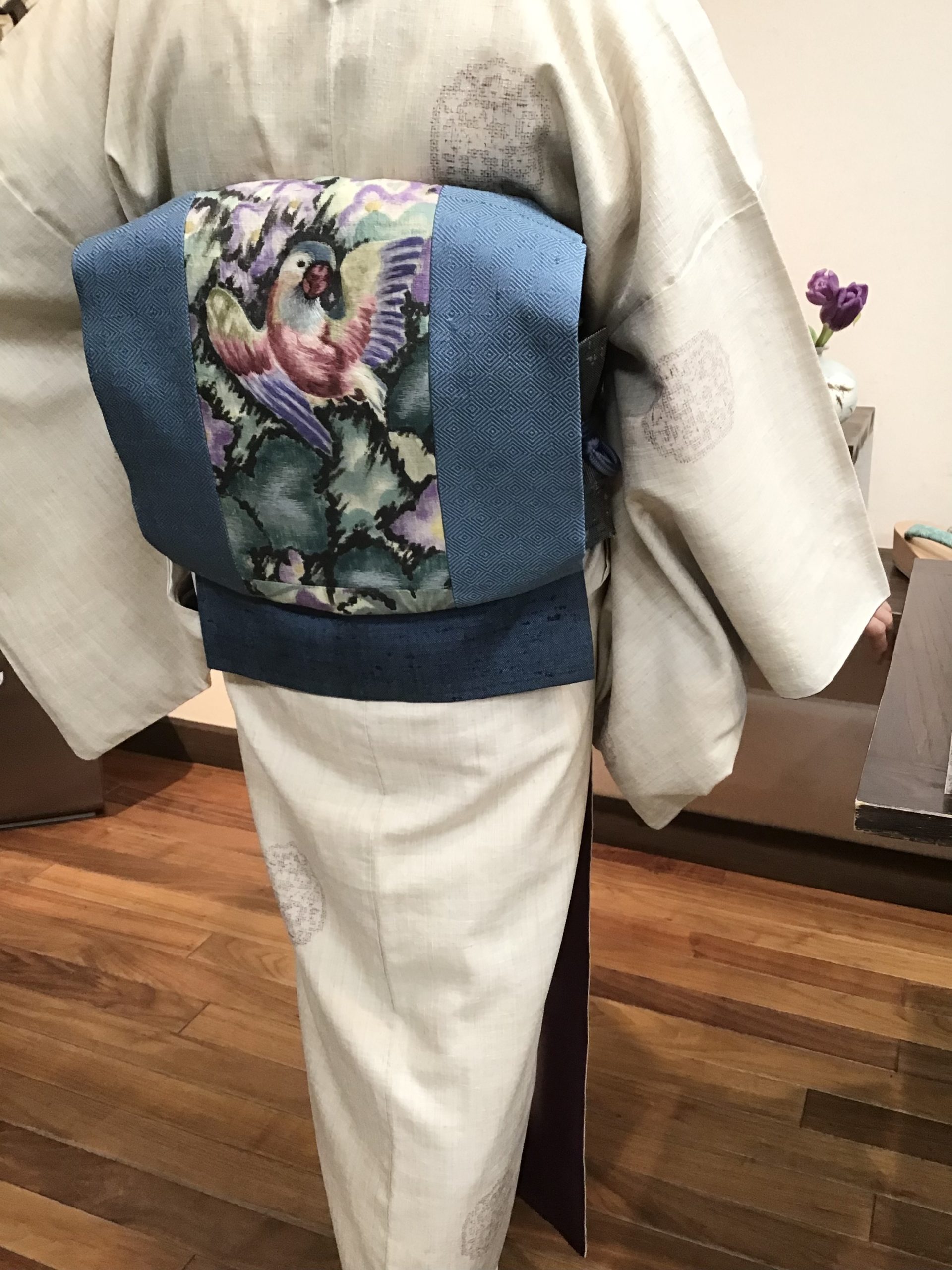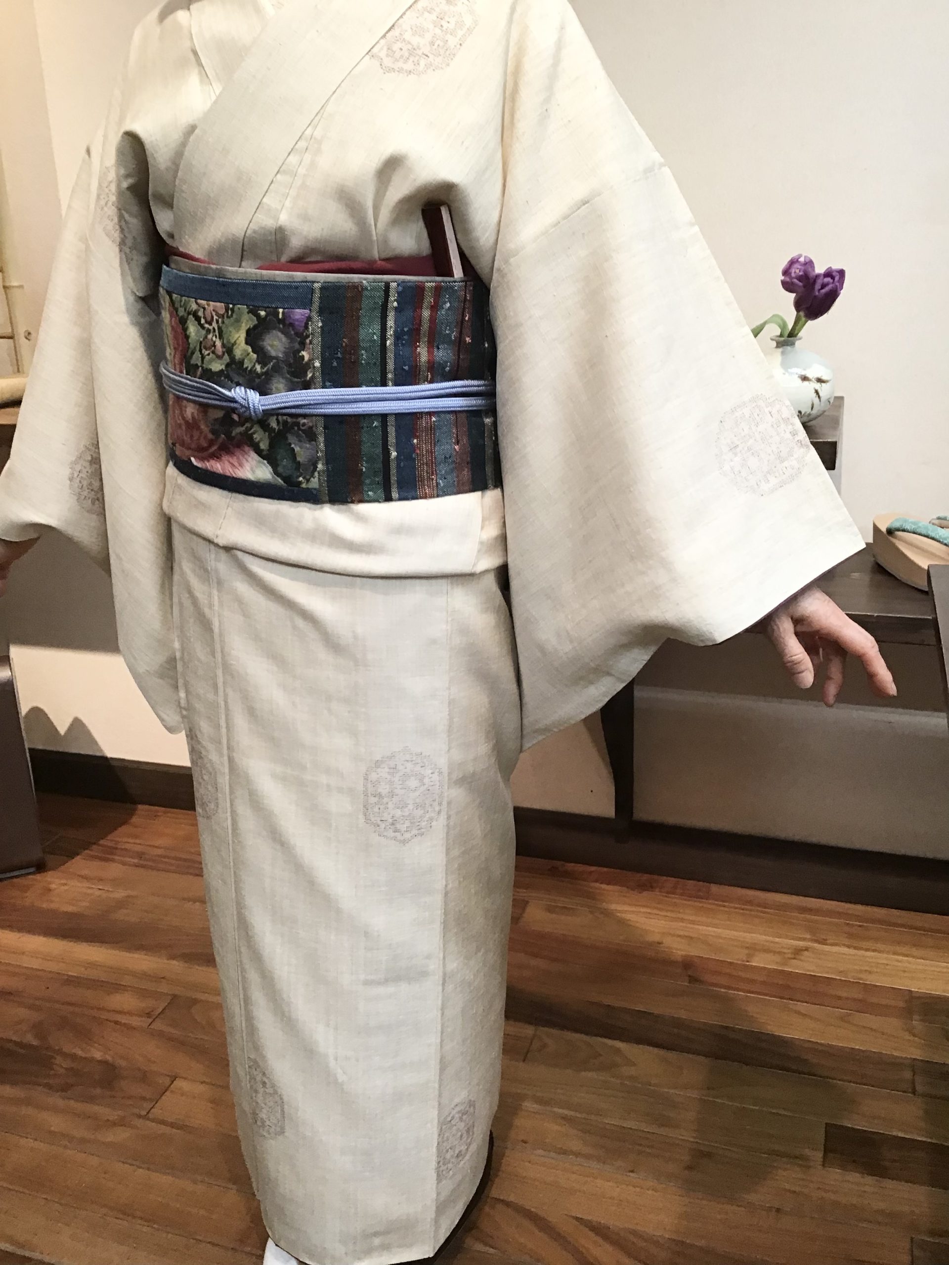 生成り色、春の上質紬に帯の中にある伊兵衛織の縞が、印象的な着姿です。
