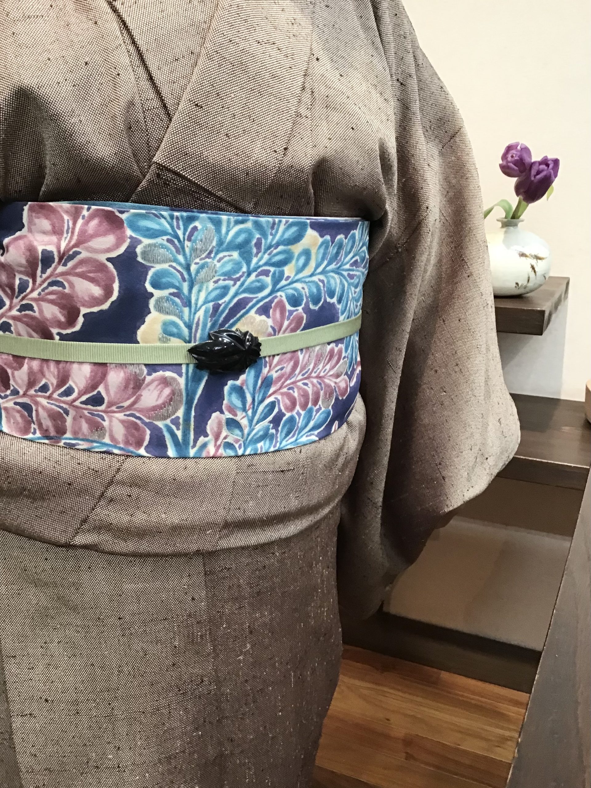 濃い茶とベージュの糸色が、混ざり合うひかえめな伊兵衛織に映える、モダンな葉模様の染め帯。