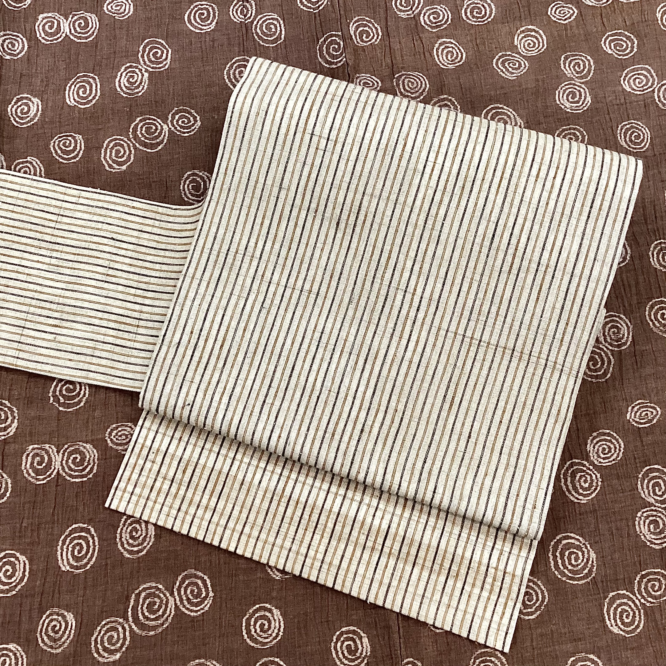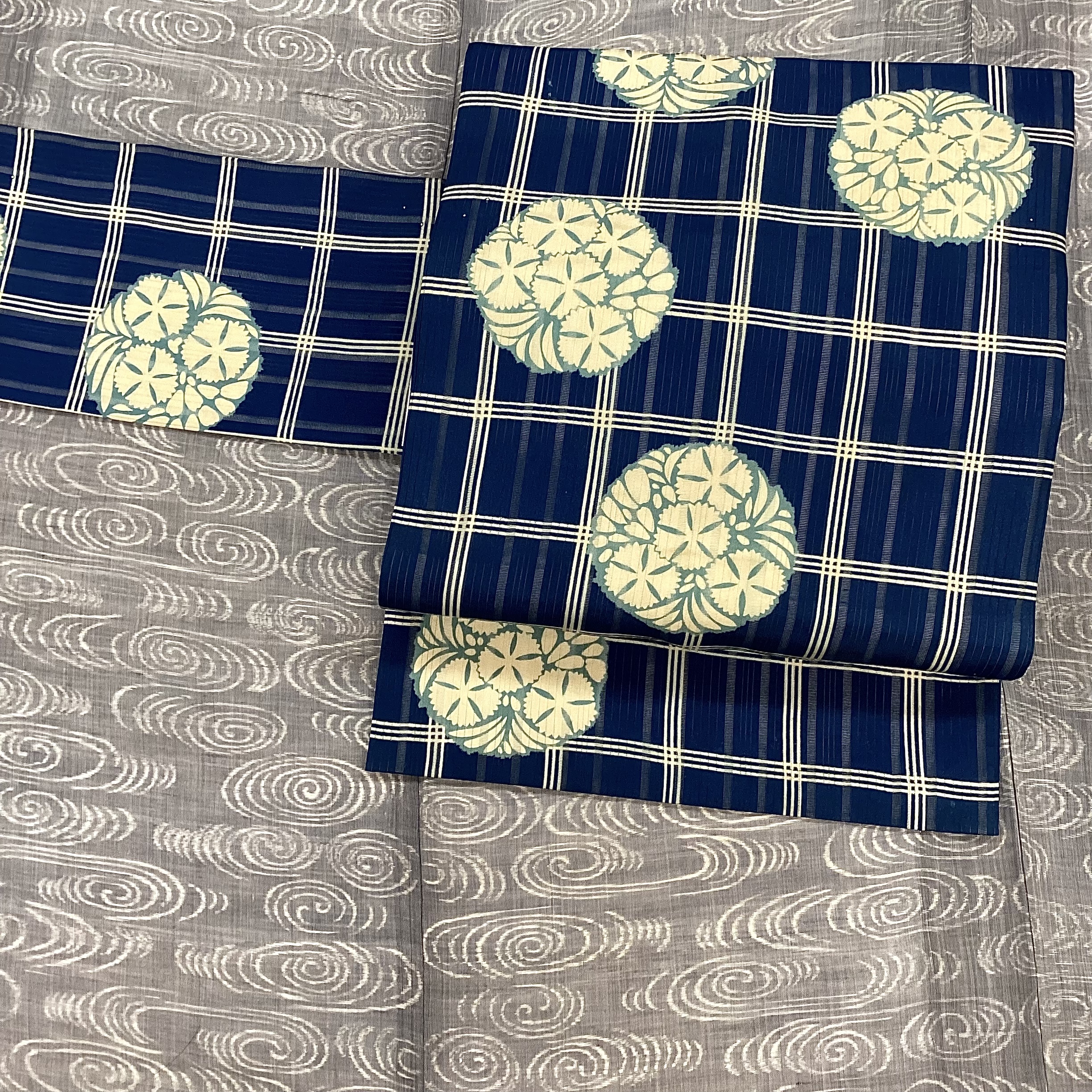 渦巻きのような可愛い柄がこんな季節でも気分を明るくしてくれるでしょう。茶縞の麻帯ですっきりと着こなしてはいかがでしょうか。