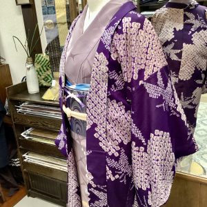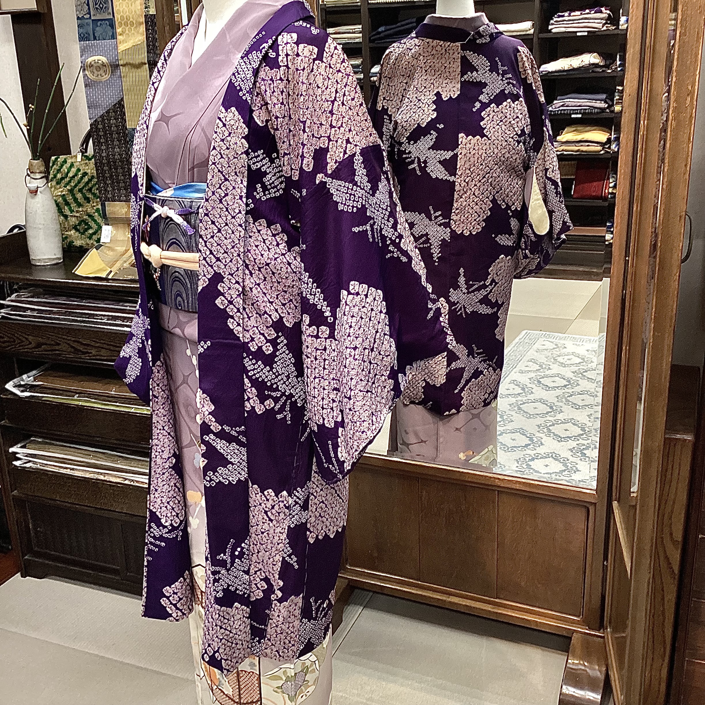 最後に昔の絞りの羽織。とても軽い着心地です。紫色が微妙に何色かで染め分けられています。