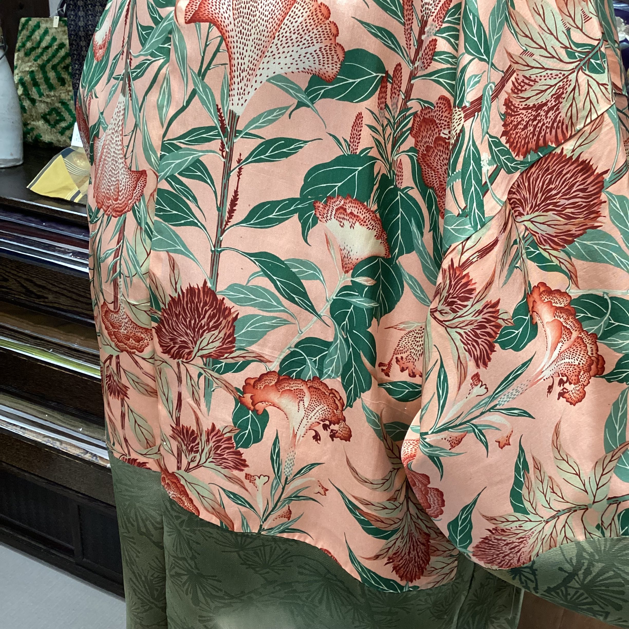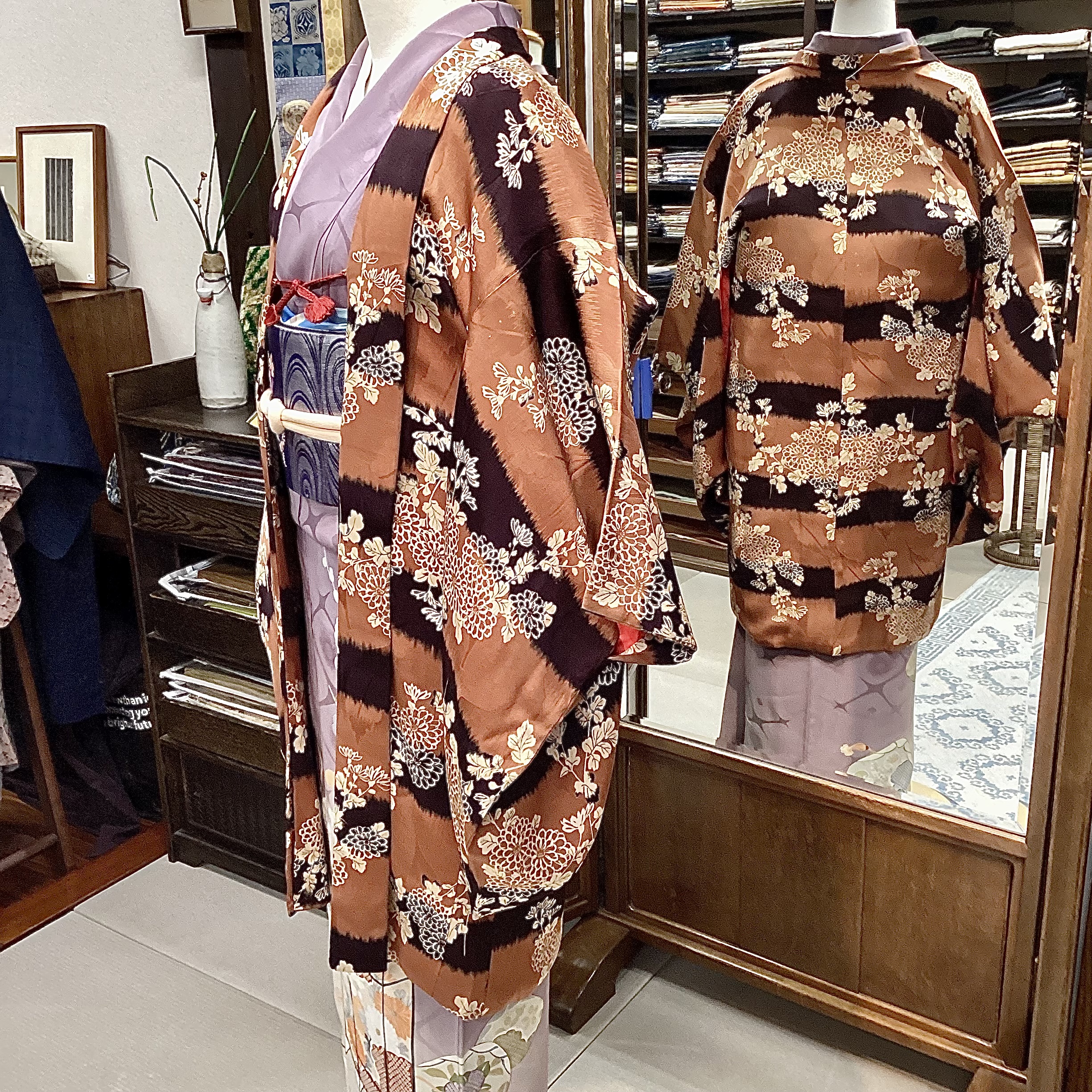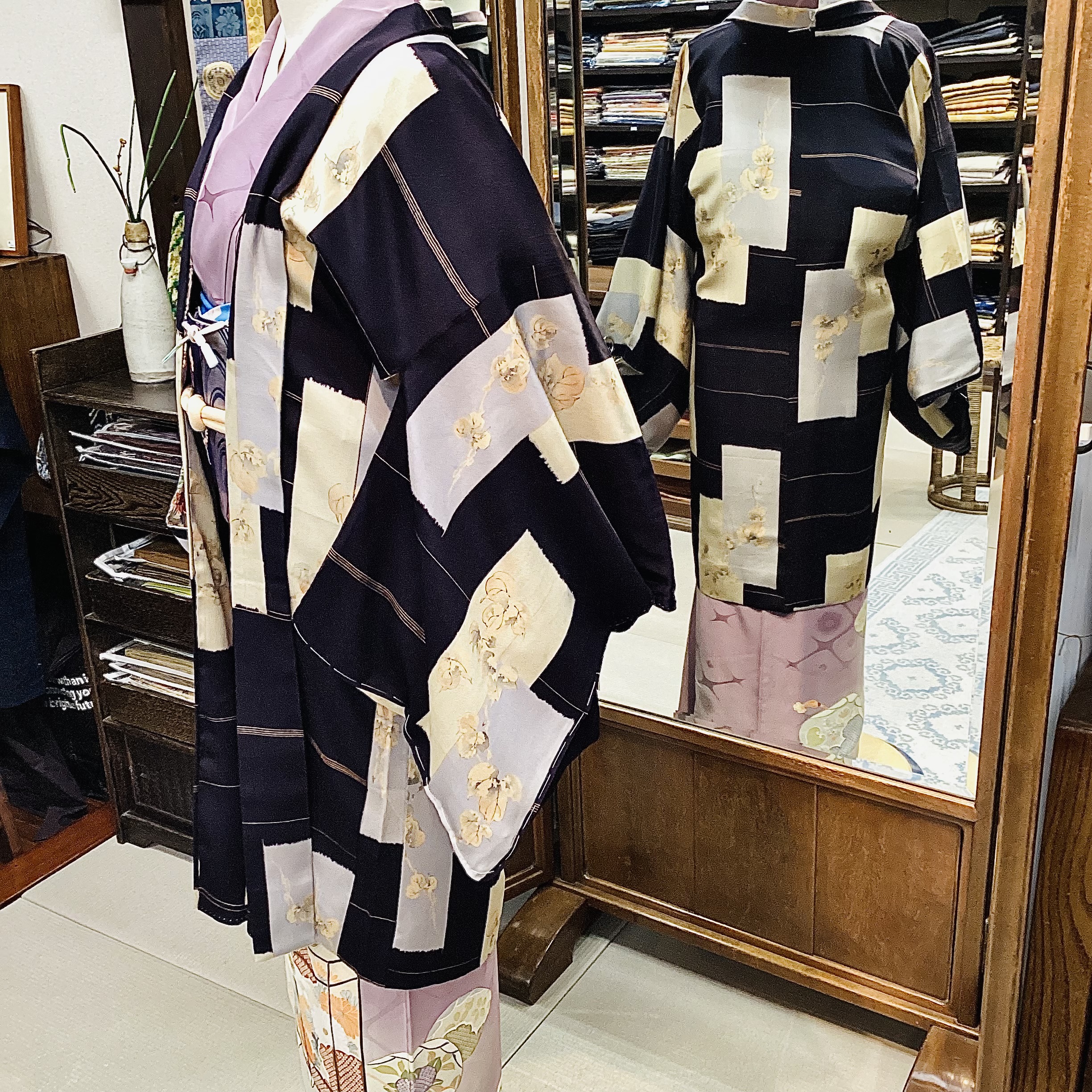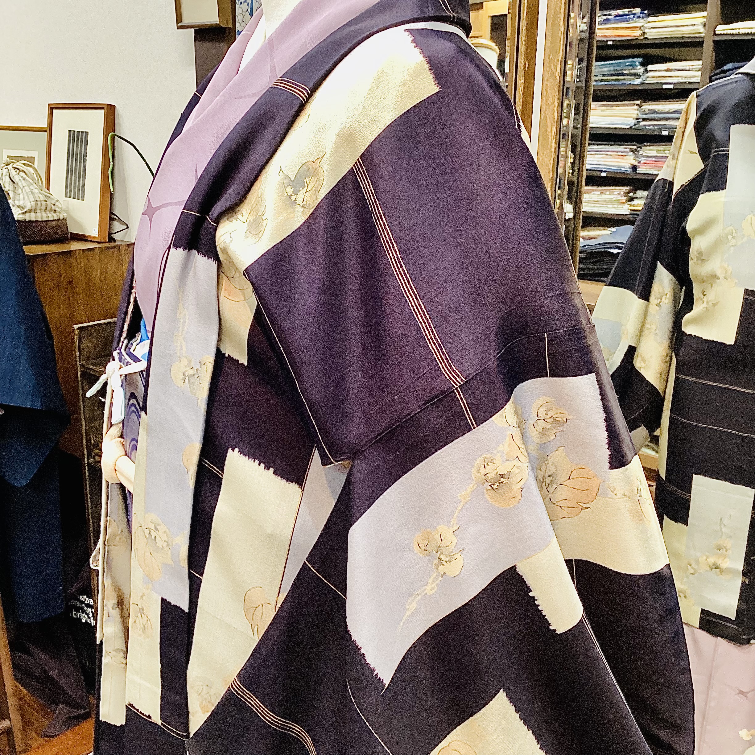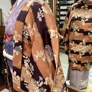 次は金茶と深い紫に染め分けられた横段に、菊のような花があしらわれています。少し袖が長いのがエレガント。