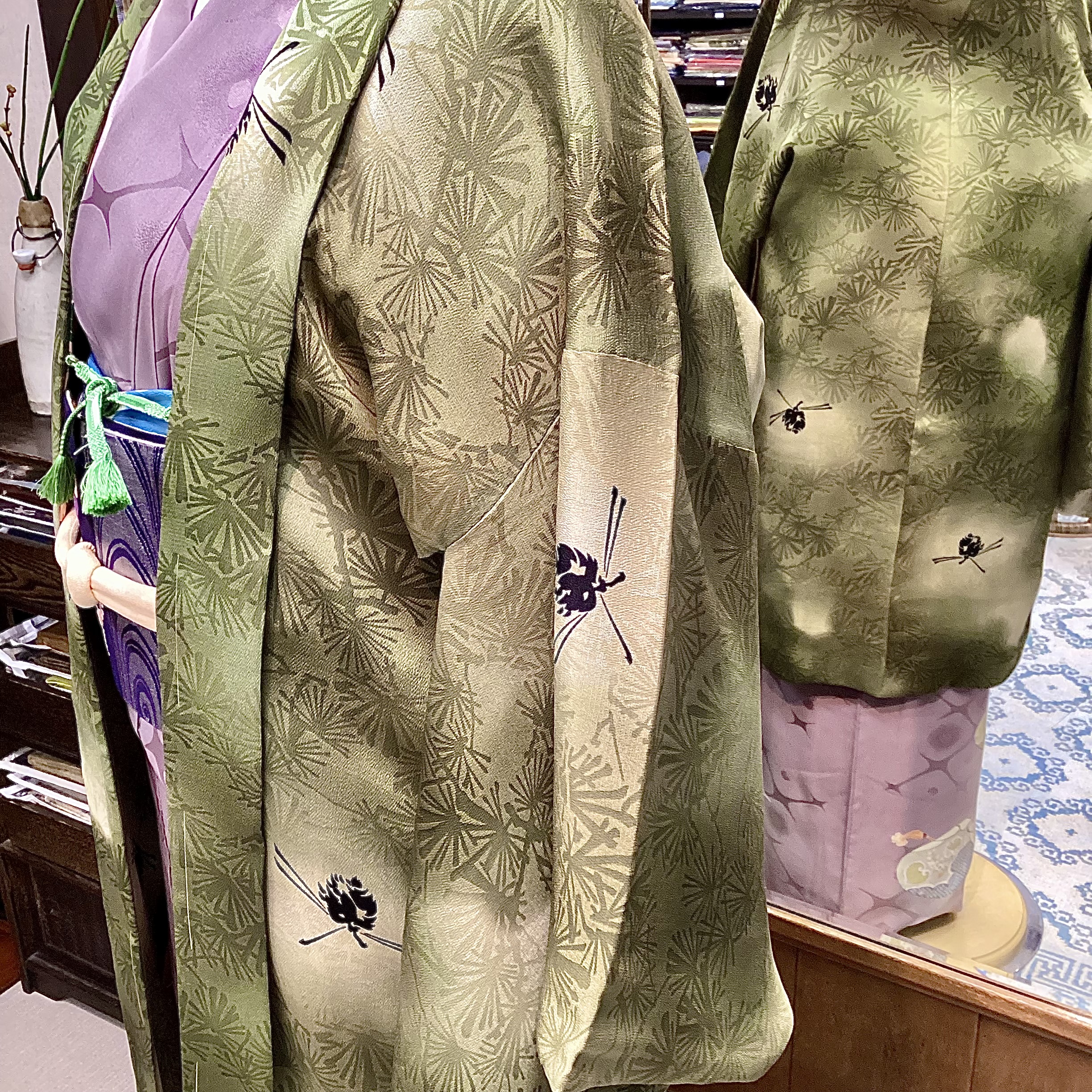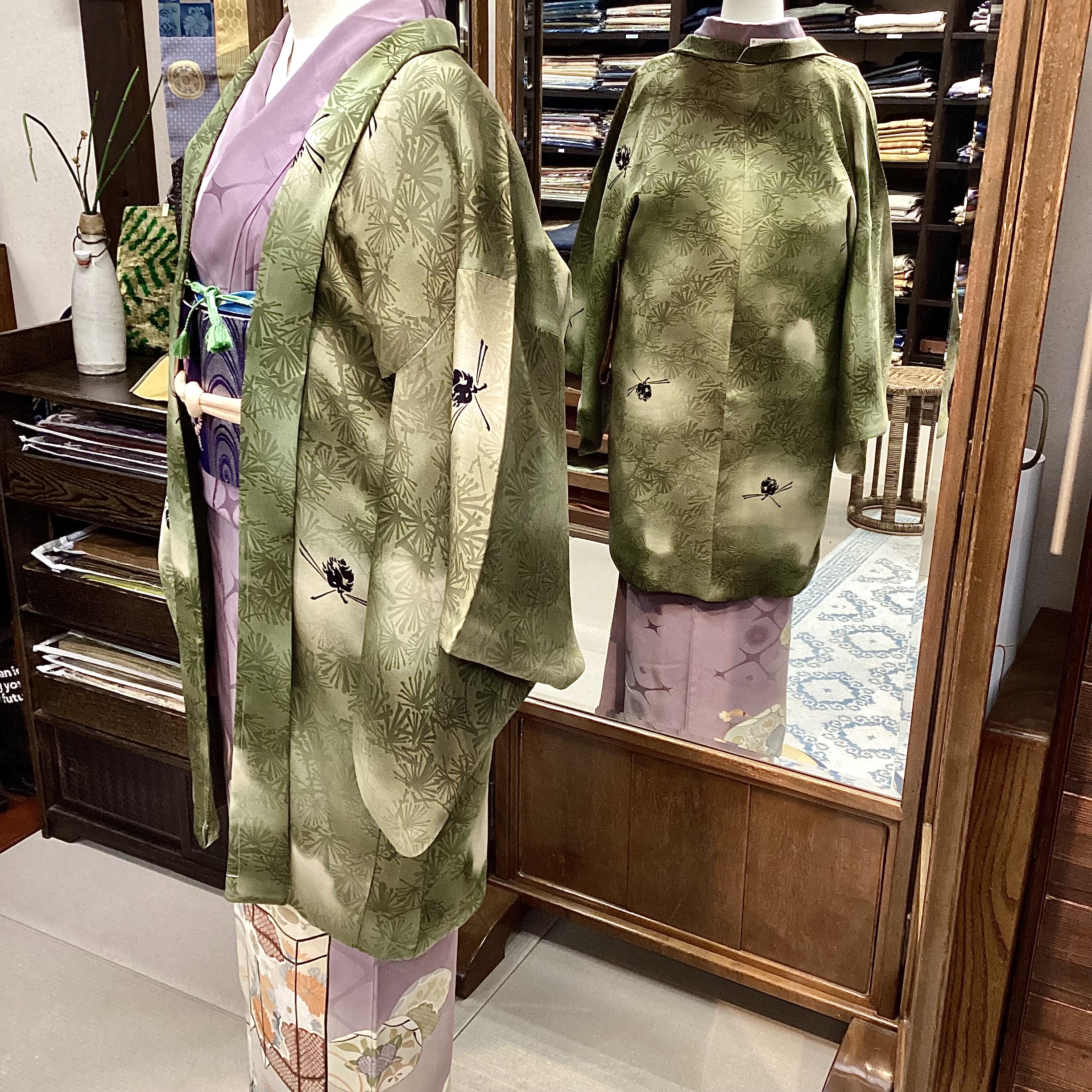 松と松ぼっくり、ぼかしも入ったシックな羽織。おめでたい柄ですが抽象的にデザインされていて、小紋柄ですのでちょっとしたお出かけにも。
