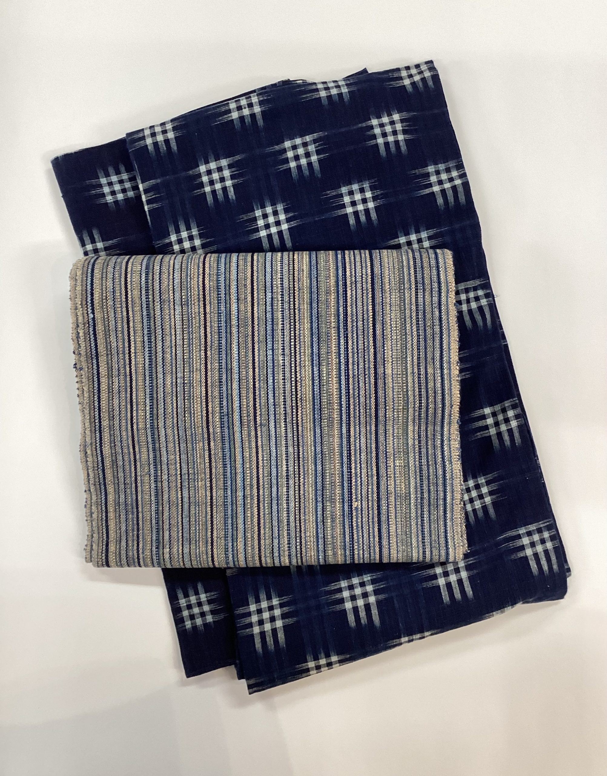 井桁文の久留米絣に縞の紬8寸単衣帯