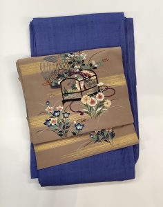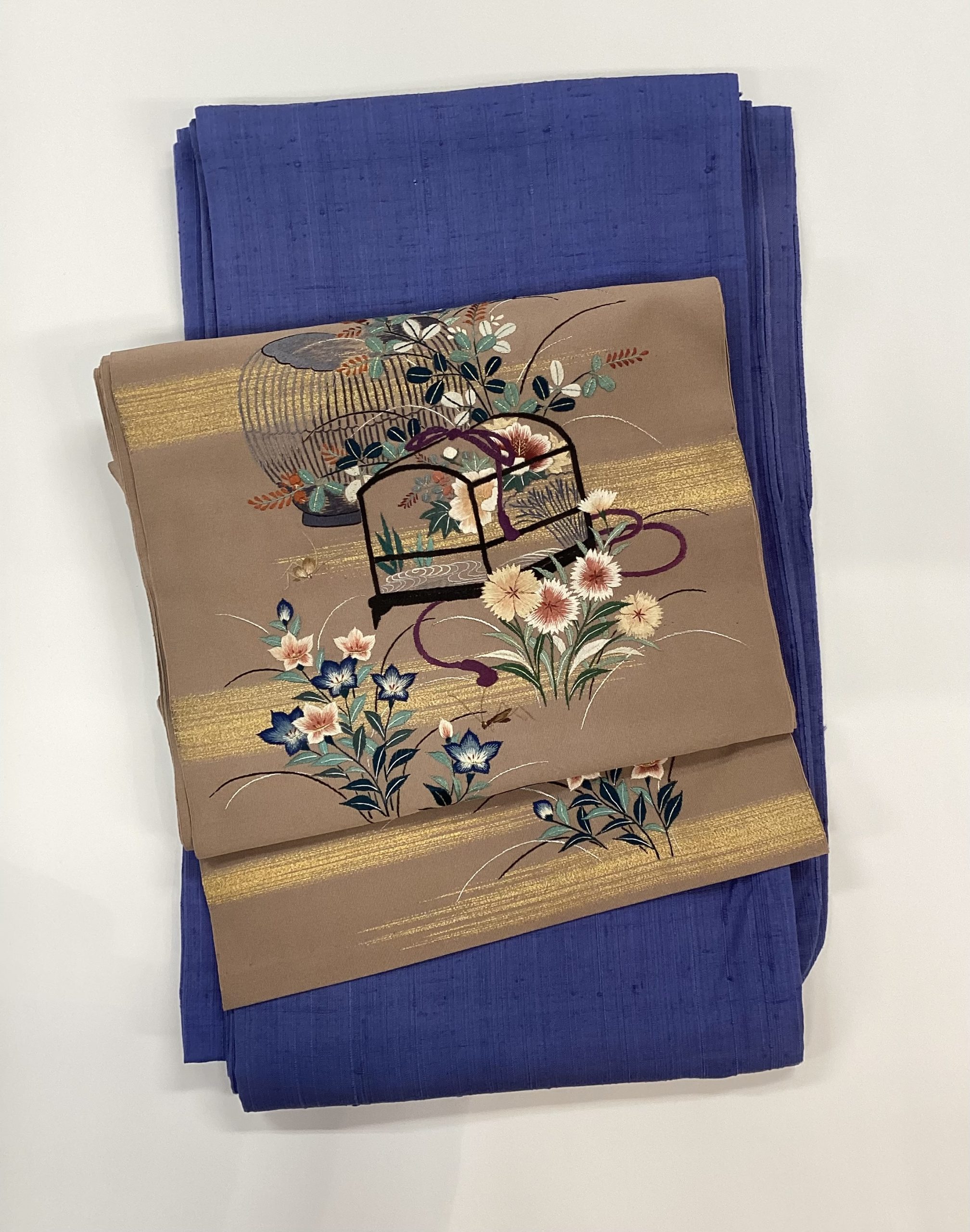 鮮やかなブルーの単衣紬にベージュ地のつづれ単衣帯。虫籠に秋草の華やかな刺繍が素敵です。