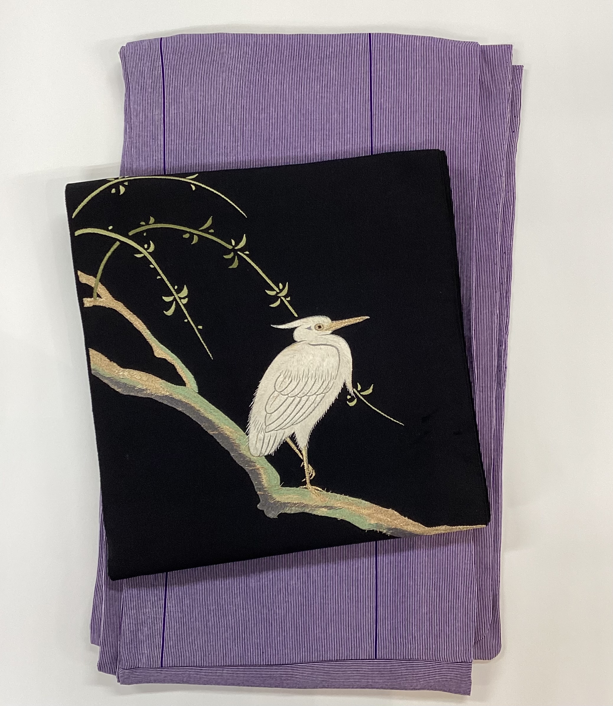人間国宝小宮康助作の紫色の粋な万筋に黒地つづれ帯、柳にサギを見事な刺繍であらわした8寸単衣帯です