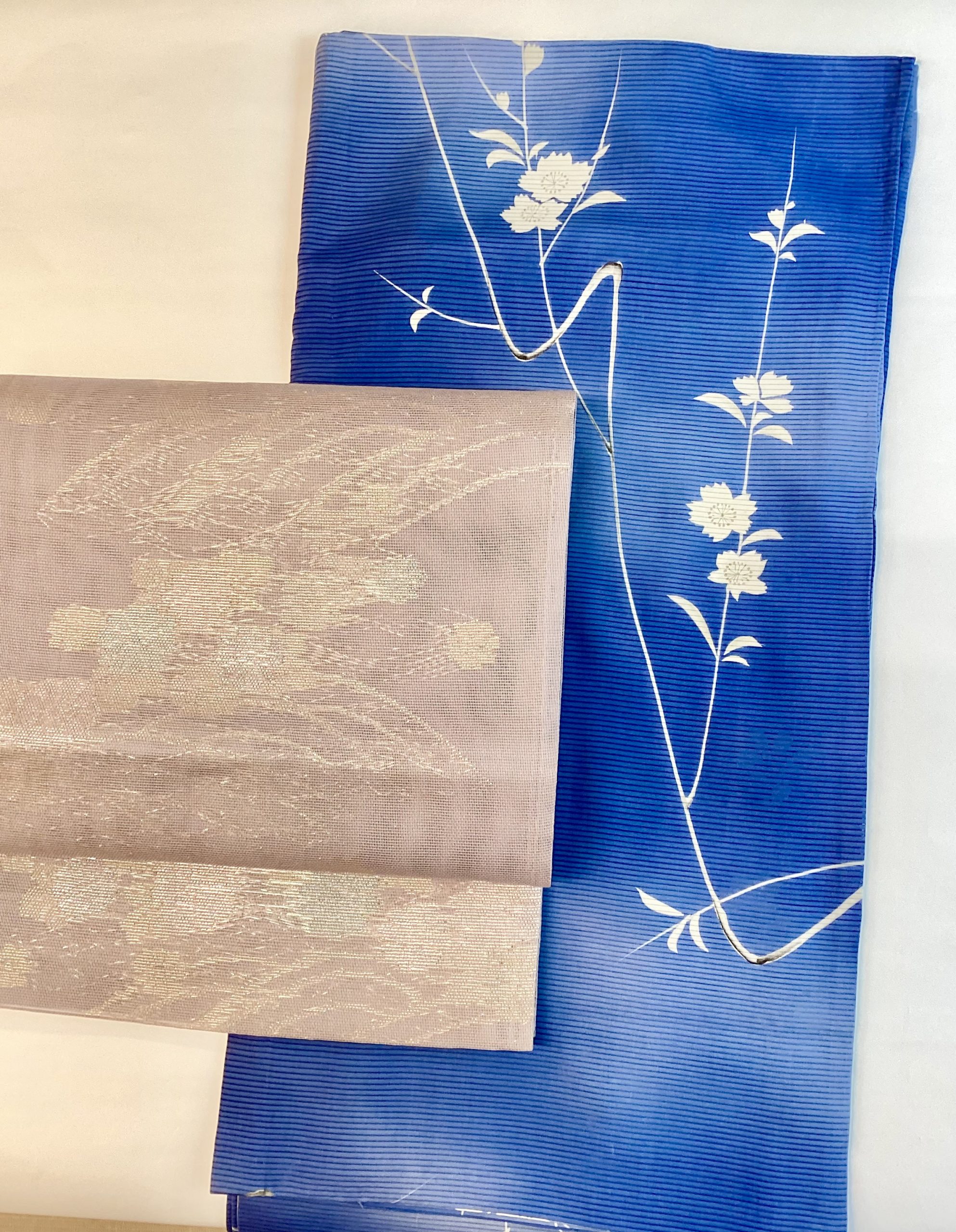 夏でも桜が着たい、桜大好きな方に。本来のピンクは避けて綺麗目ブルーの平絽の小紋とやさしいラベンダー色の紗の織り帯。控えめに金銀糸が織り込まれています。
