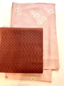 ピンクの撫子の平絽小紋とレンガ色の紗の織り帯のキュートでやさしい取り合わせ