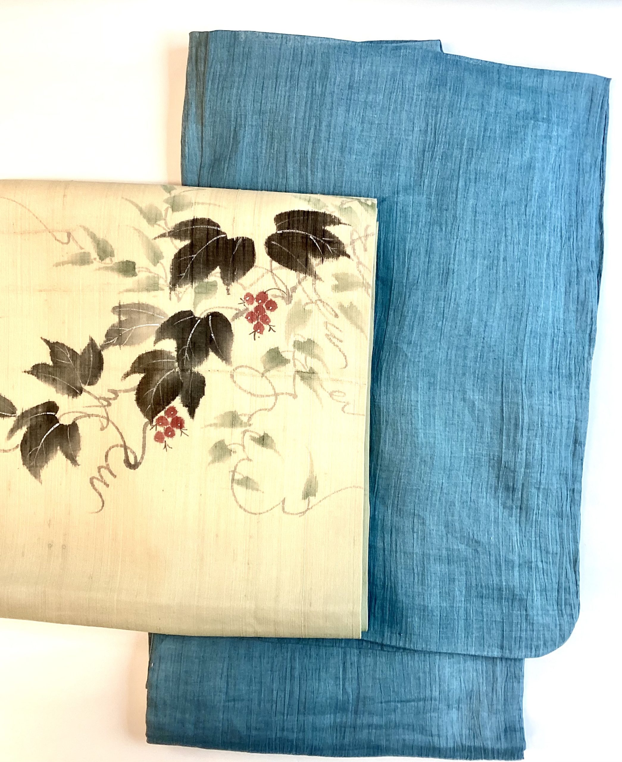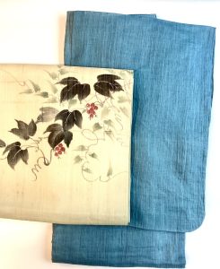 変わりブルーの小千谷縮と秋を先取りの葡萄を描いた麻の爽やかな