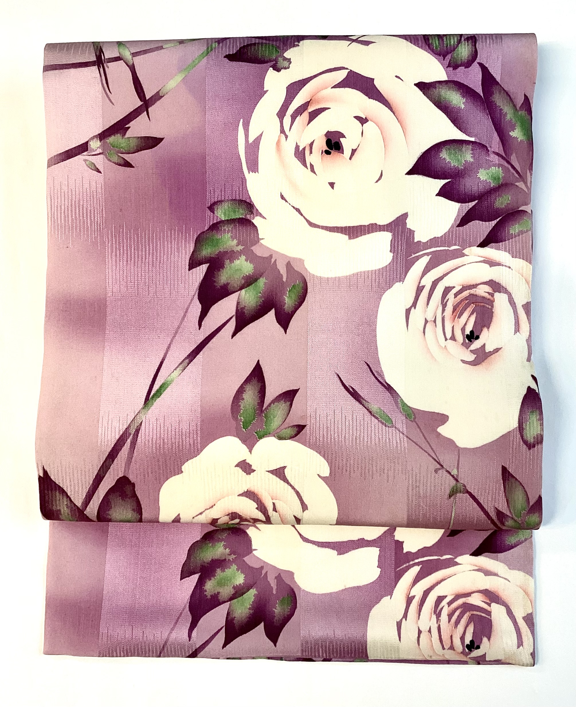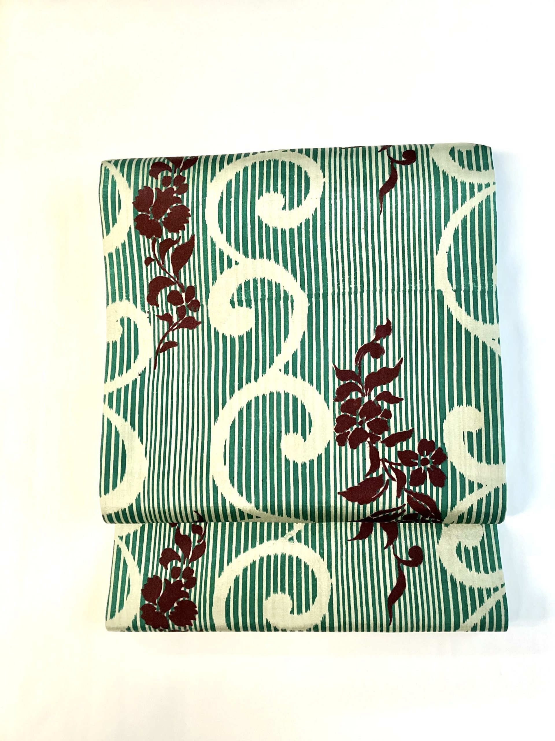 爽やかなグリーンの縦縞に濃紫の唐草、唐草文は葉や茎、蔓植物が伸びたり絡んだりした姿を図案化したものの、日本での呼称だそうです。