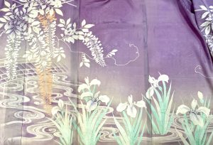 今まさに旬!菖蒲を少しデフォルメしたモダンな小紋に綺麗な無地の帯。梅雨近い鬱陶しい季節にも爽やかな色目の取り合わせ。