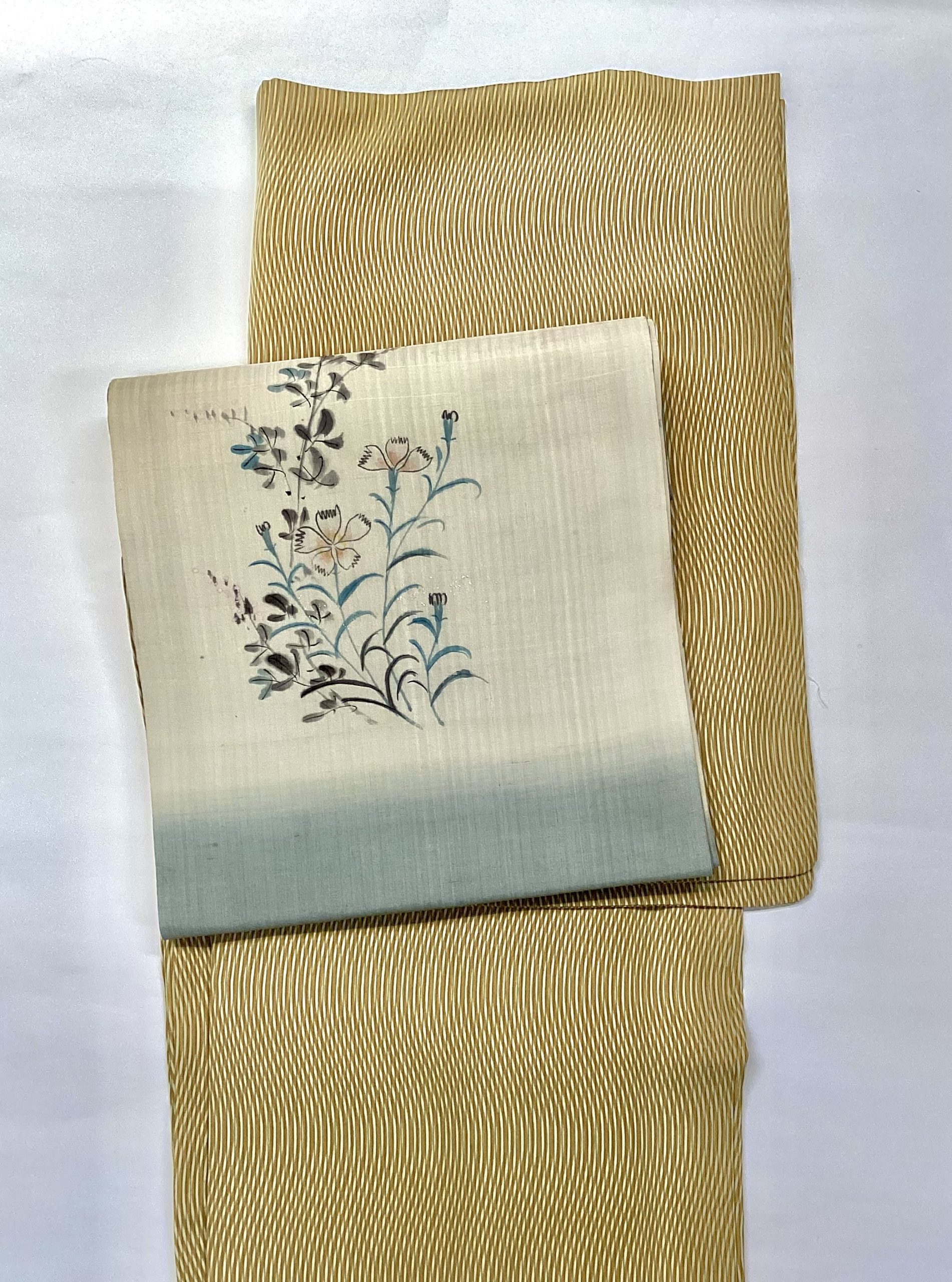 よろけ縞の辛子色小紋に萩と撫子文様の染帯