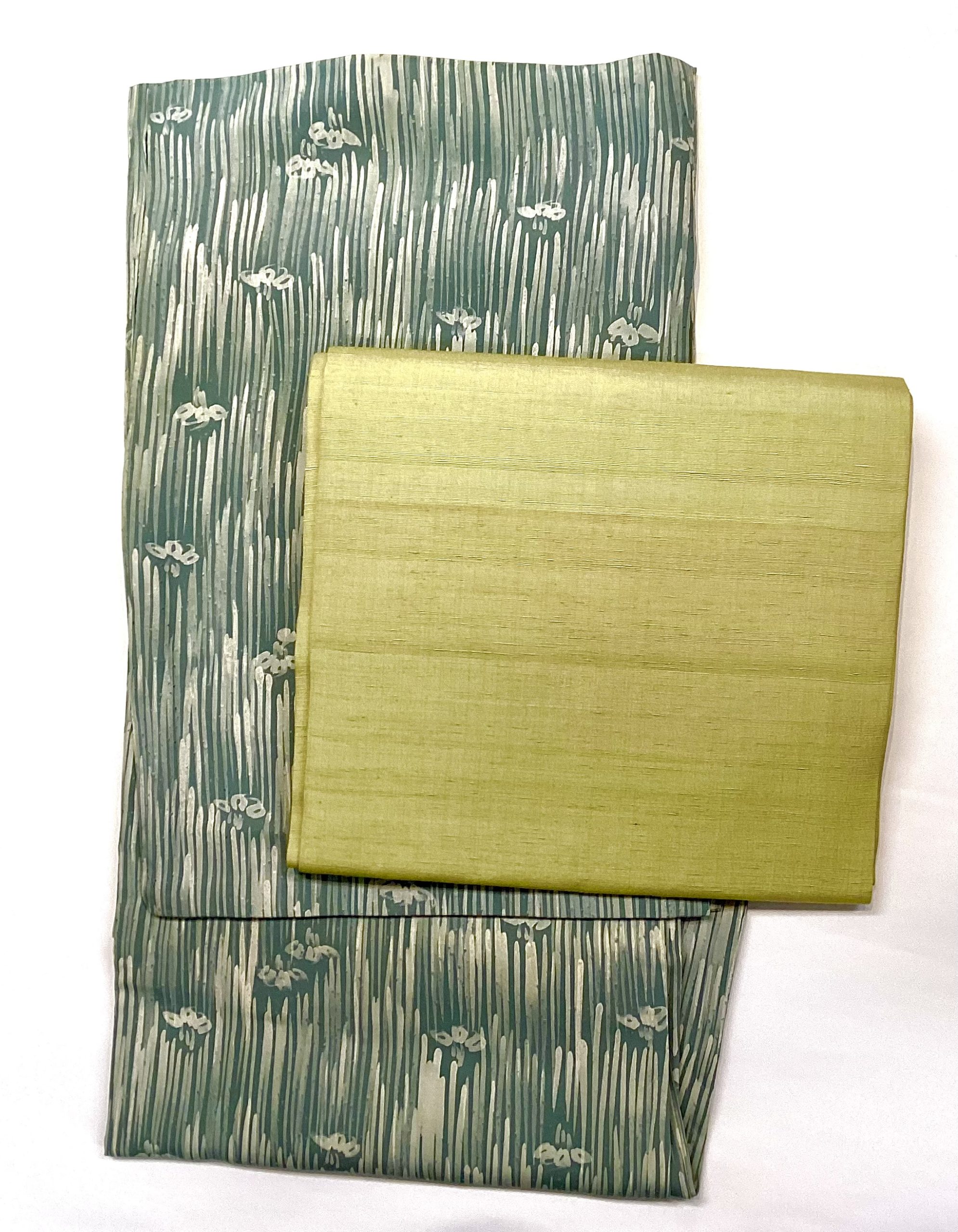 わさび色の菖蒲の単衣小紋にうぐいす色の無地紬帯