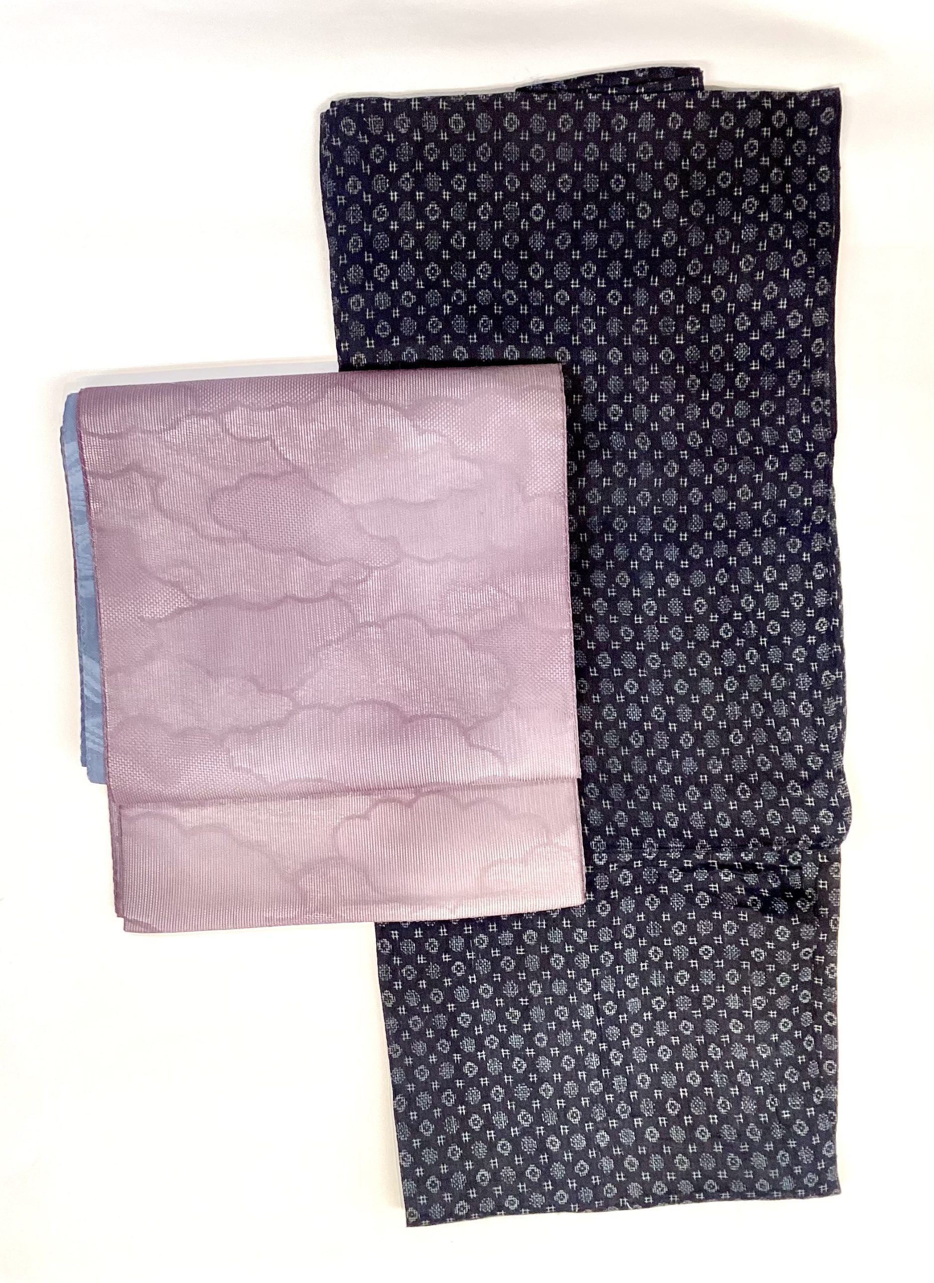 丸く細かく可愛い絣を織り込んだ濃い藍色の宮古上布に濃い藤色(裏面水色)の紗の腹合わせ帯