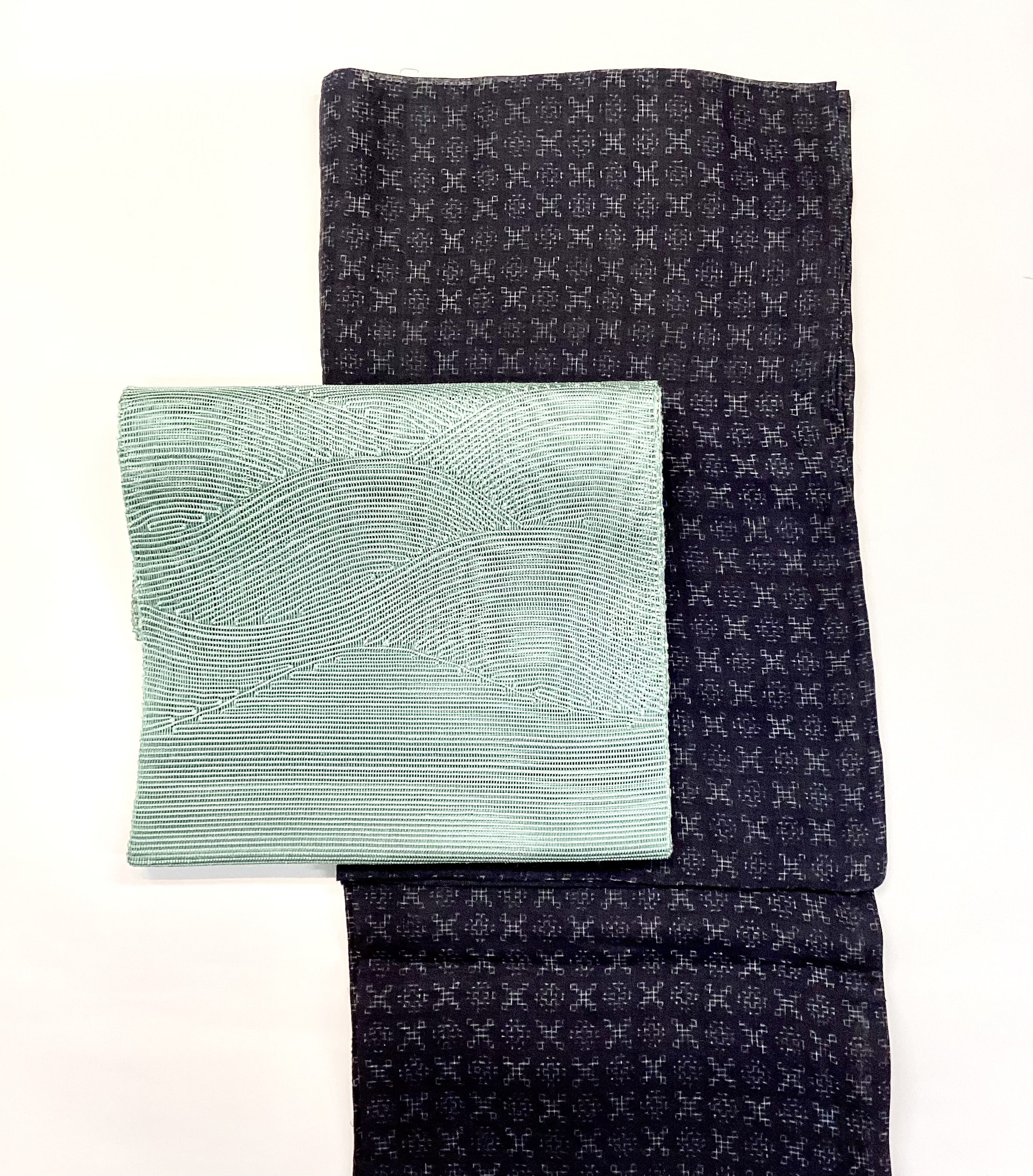 幾何学文様の黒地宮古上布とさわやかな青磁色に波紋様の羅の帯
