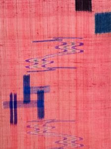 琉球王国はその昔、地の利を生かした交易と、明るく開放的な国民性とで、特異な染織文化が花開きました。例えば、南方の島々のほとんどは縦イカットですが、その決まり事に飽きて、緯糸にも入れてダブルイカットが生まれたとか、絣柄は、自然を観察した創作ではなくて、たまたま織ったのが、エサ箱のようだ、銭玉のようだ、と、なってきたようです。