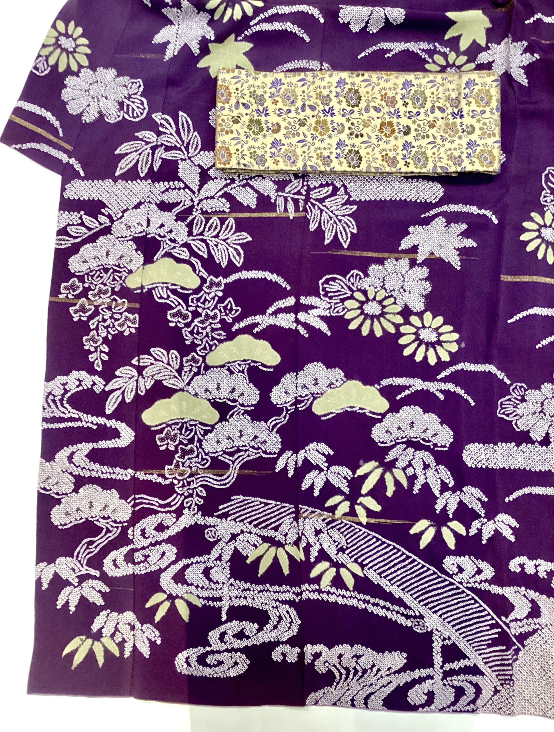 こっくりした紫の絞り疋田の素敵な庭園紋様の訪問着。帯は着物の華やかさを失わないように控えめな織の半幅で。