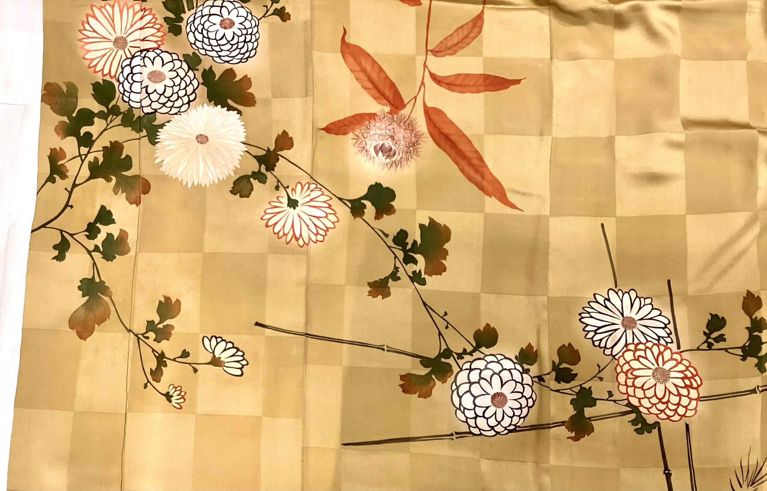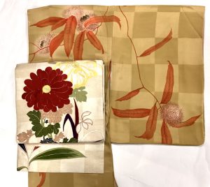 金茶地に大きな市松地紋、菊に栗を華やかに置いた可愛い付下げ、帯はこれも大胆に菊を刺繍した名古屋帯