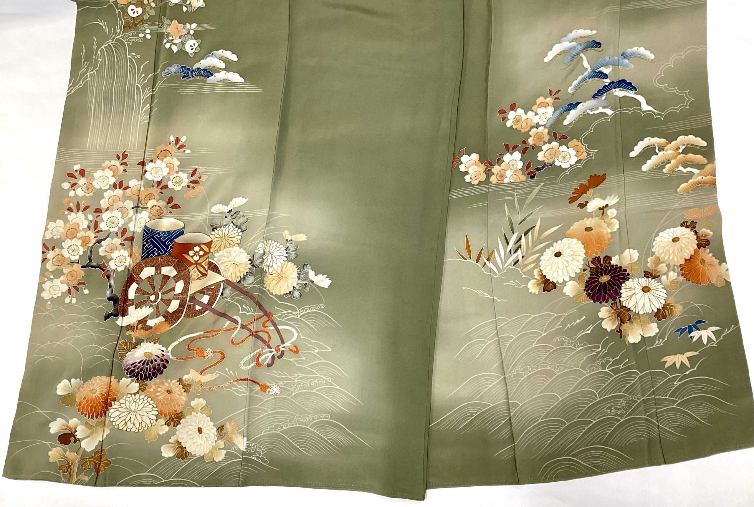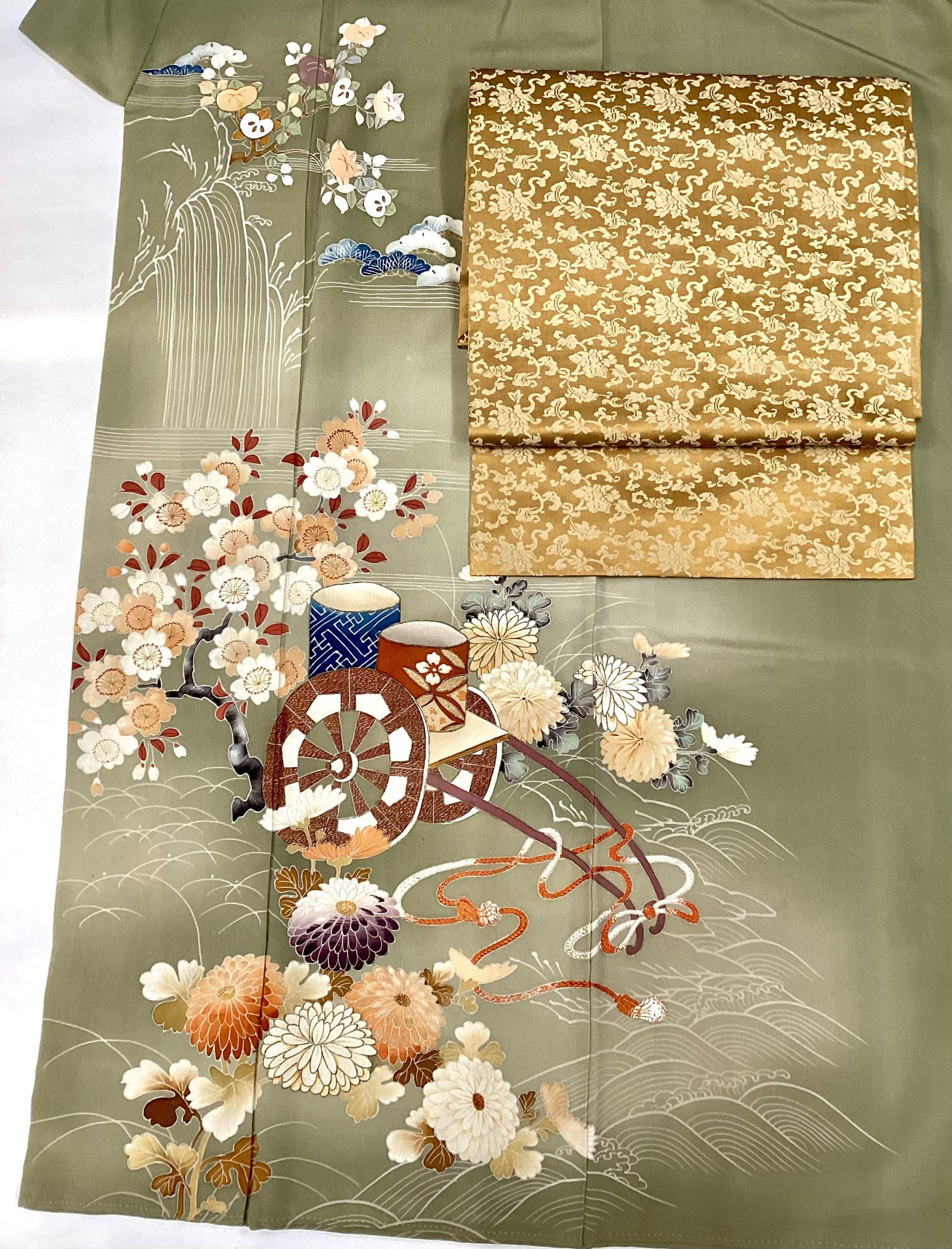 鶸色の品よい地に桜菊橘を描いた中に潮汲み桶を置いた文芸の香りあふれる五つ紋の付下げ。帯は光によっておさえた金色の丸帯崩しの名古屋帯