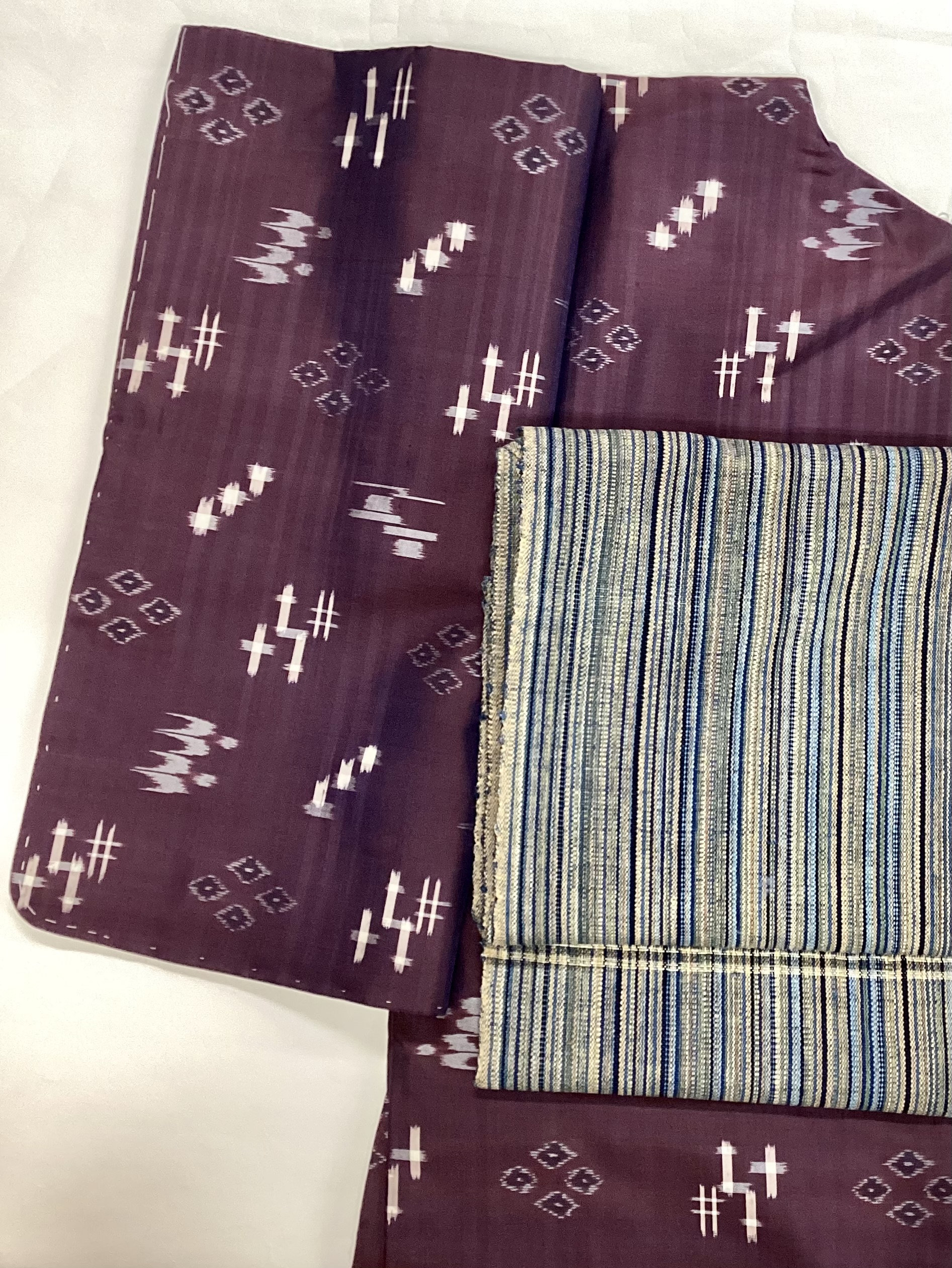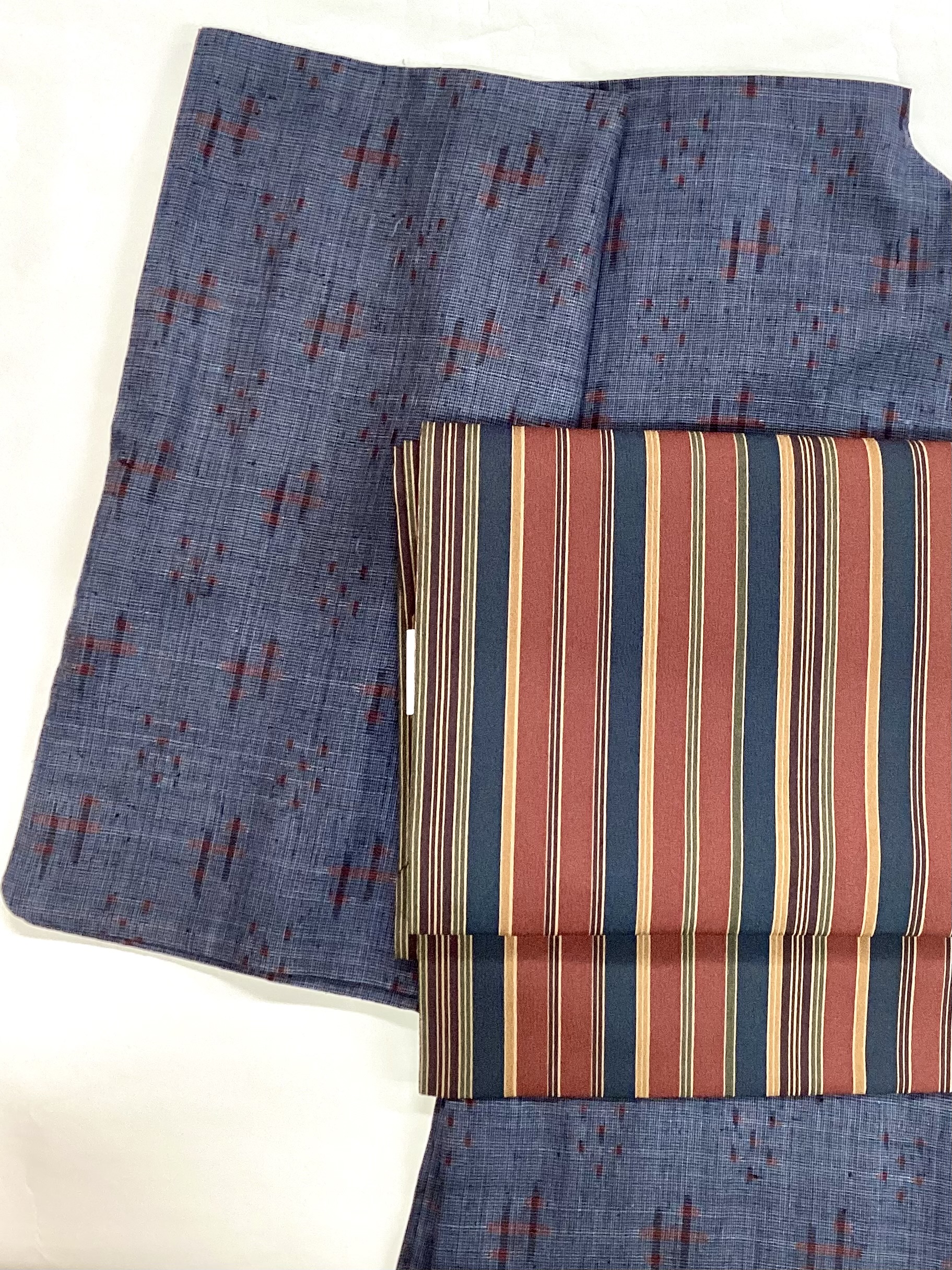 紫地の首里紬。沖縄の代表的絣紋様の滑らかな着物に、シックな色合いの木綿の縞帯