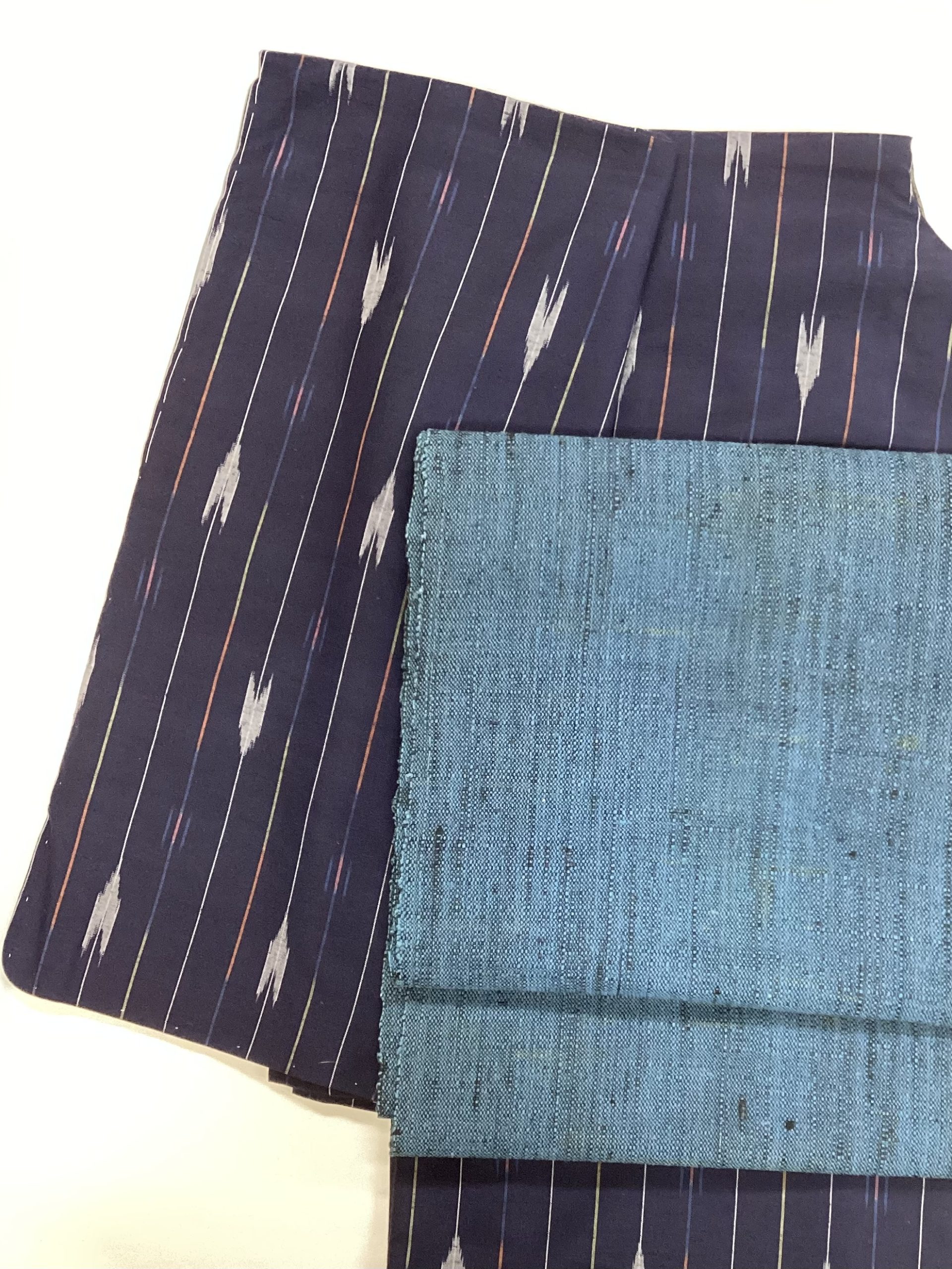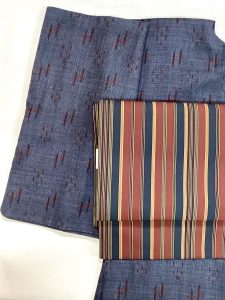 紺地に細かな縞と矢羽文様を織り出した気軽に着ていただける寸法もたっぷりな着物と綺麗な無地の紬帯
