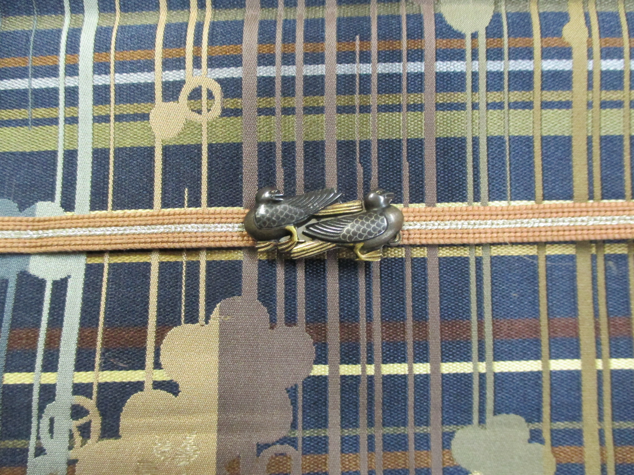 仲睦まじい2羽の水鳥の帯留。大津絵の着物の下前にも、鳥が描かれています。