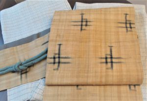 合わせた帯は、芭蕉布の名古屋帯。芭蕉布は暑い土地にかなった布です。張りのある布なので、帯で楽しむのも一つの手段です。藍色の絣が入っていて、その土地の大らかさを感じる帯です。