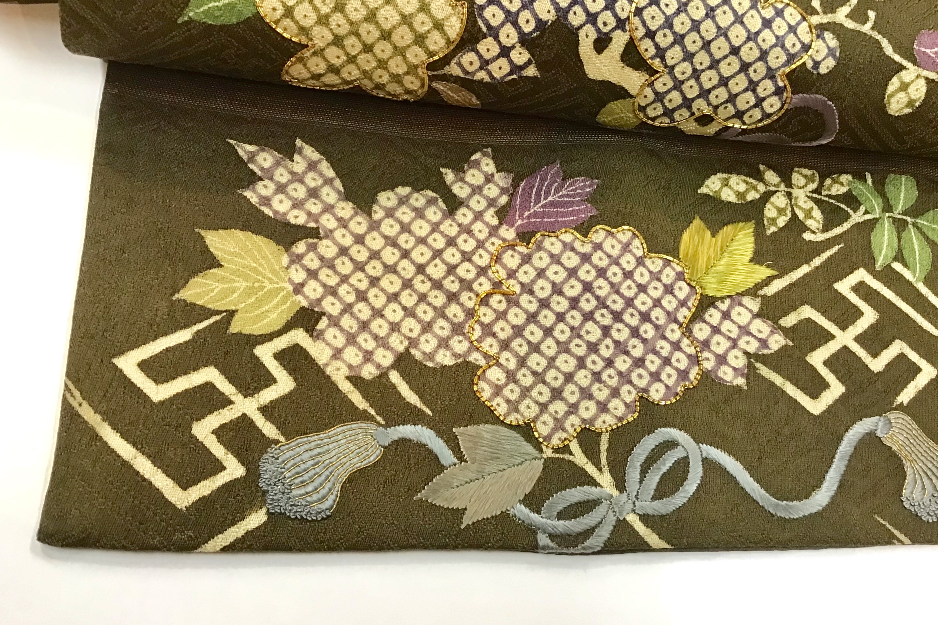 秋にぴったりの鶯茶地に、細やかな刺繍と刷疋田に金糸の駒留を施した贅沢な仕上がりです。