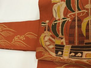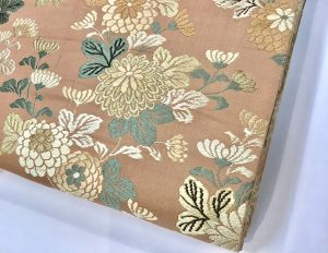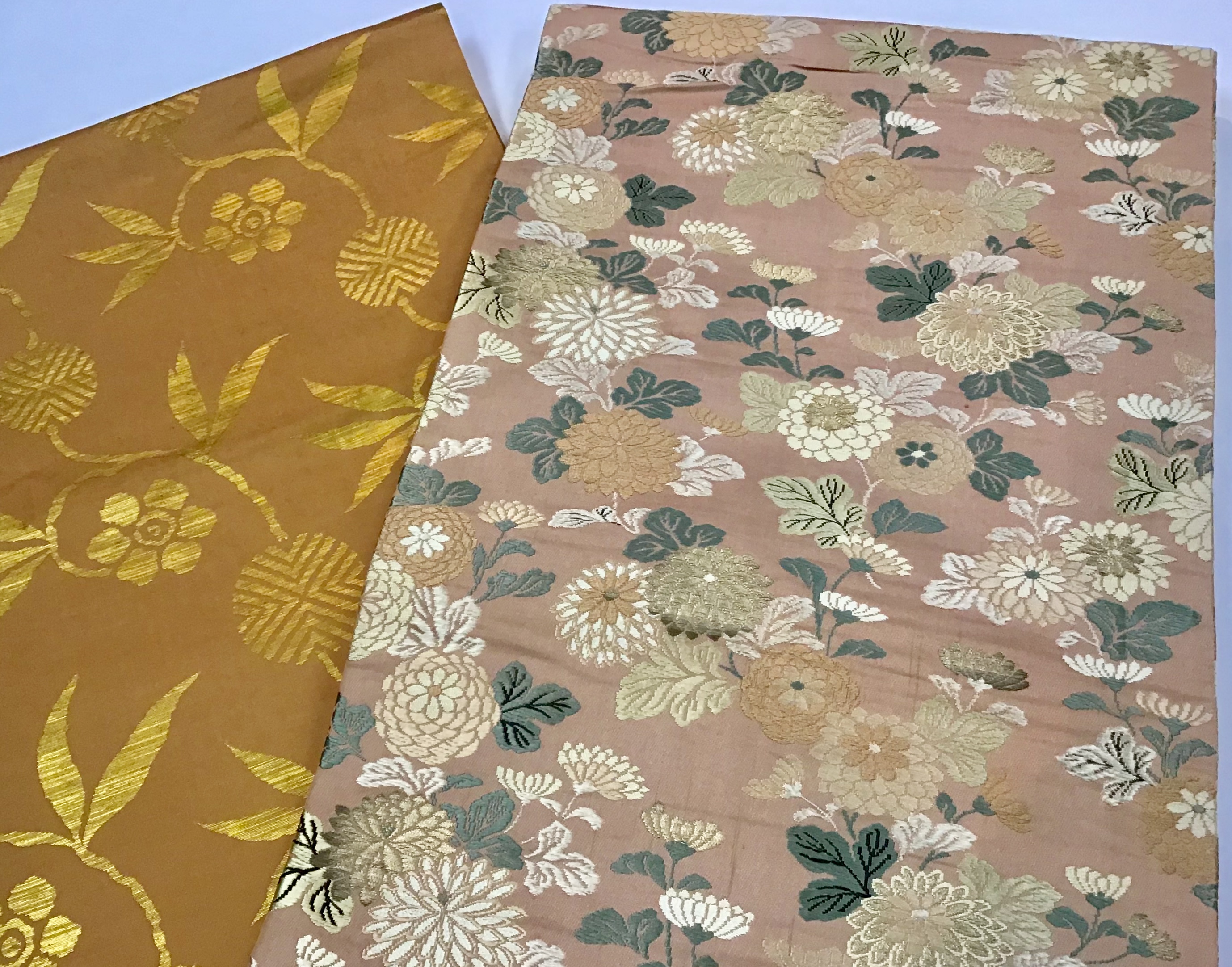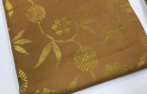 丁子色に金で吉祥文様の笹蔓緞子が織り出されている丸帯。