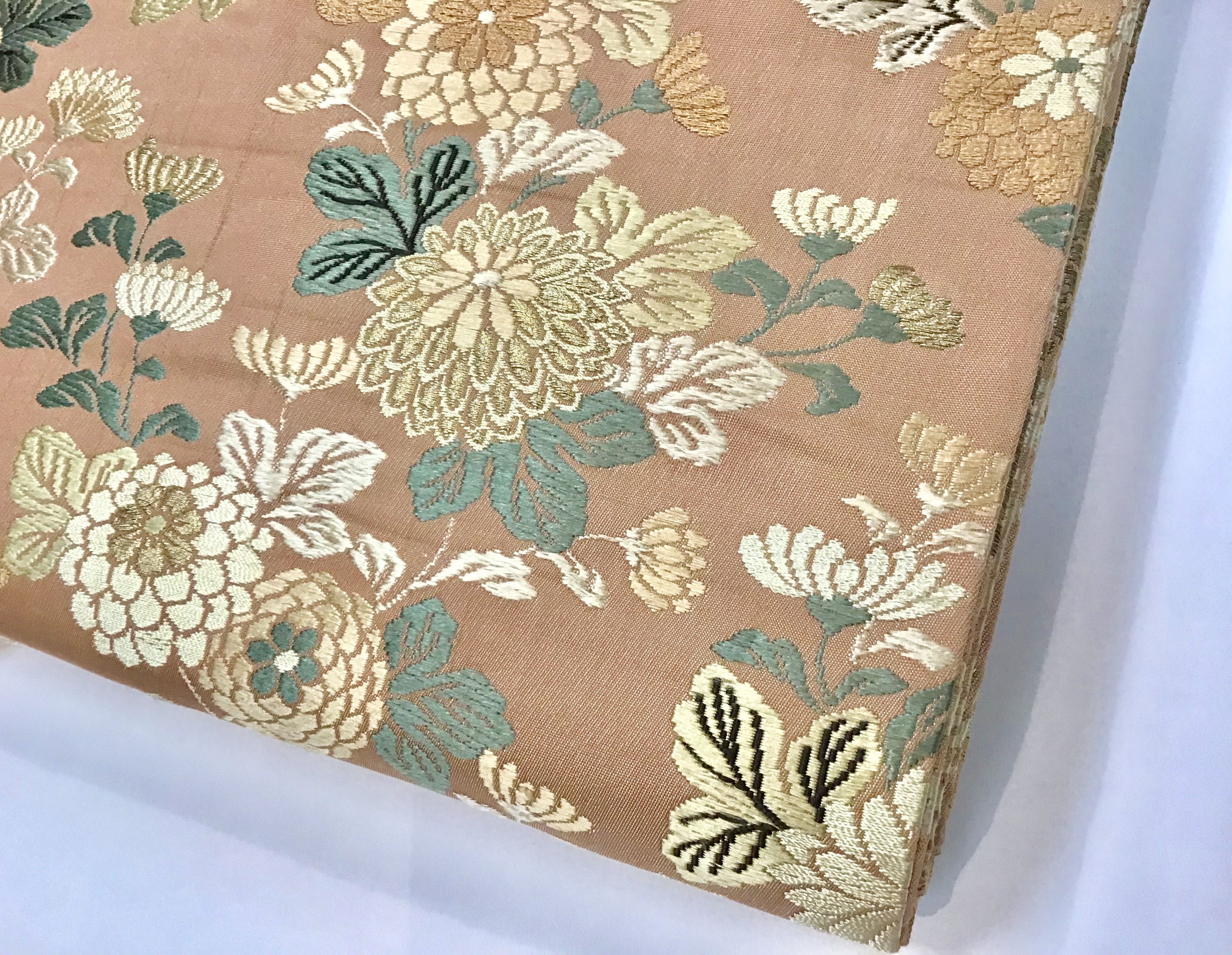 薄い紅花色に菊の刺繍がふんだんに施されている丸帯と