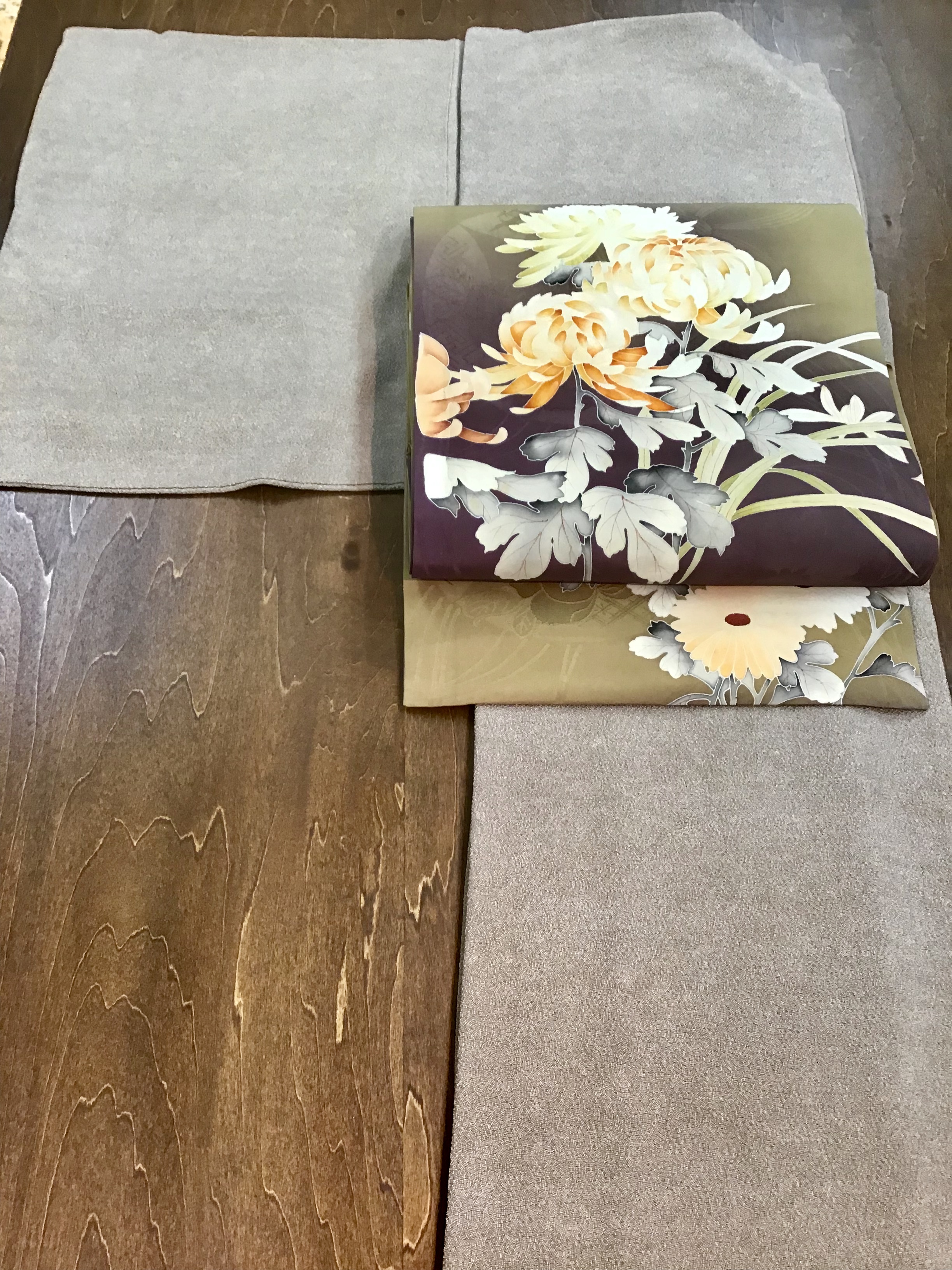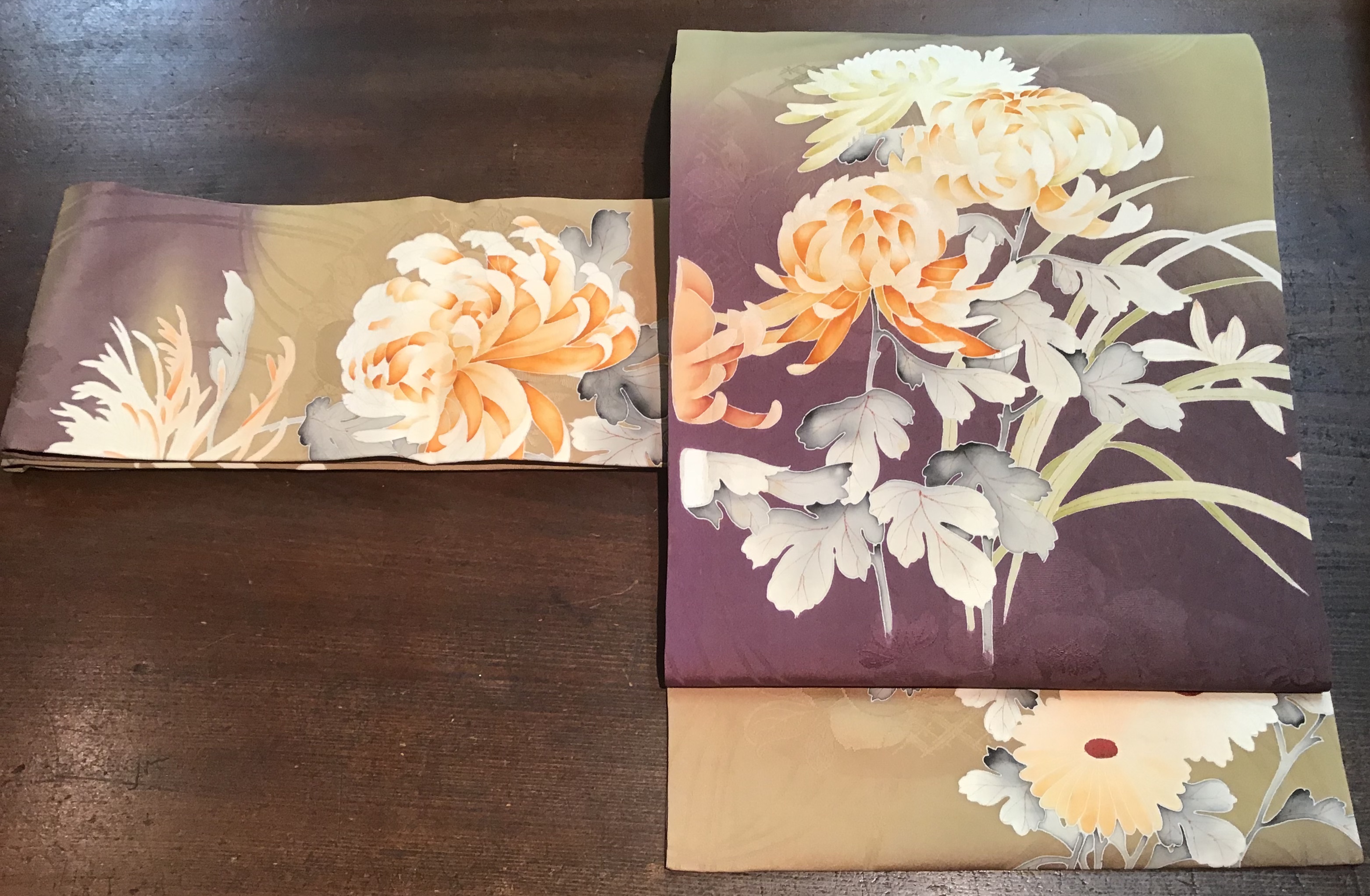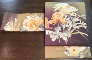 続々と秋柄 空気の揺らめきを醸し出すような地色に優しい色味の菊が、どこか儚げな帯の雰囲気を作り出しています。 地紋は七宝に紗綾形や菱、結われた紐がくす玉のようにも見え、牡丹など秋の草花も織り出された優雅な帯になりました。 色無地や江戸小紋など、柔らか物によく似合う一本です。 菊柄染名古屋帯 35000円+税