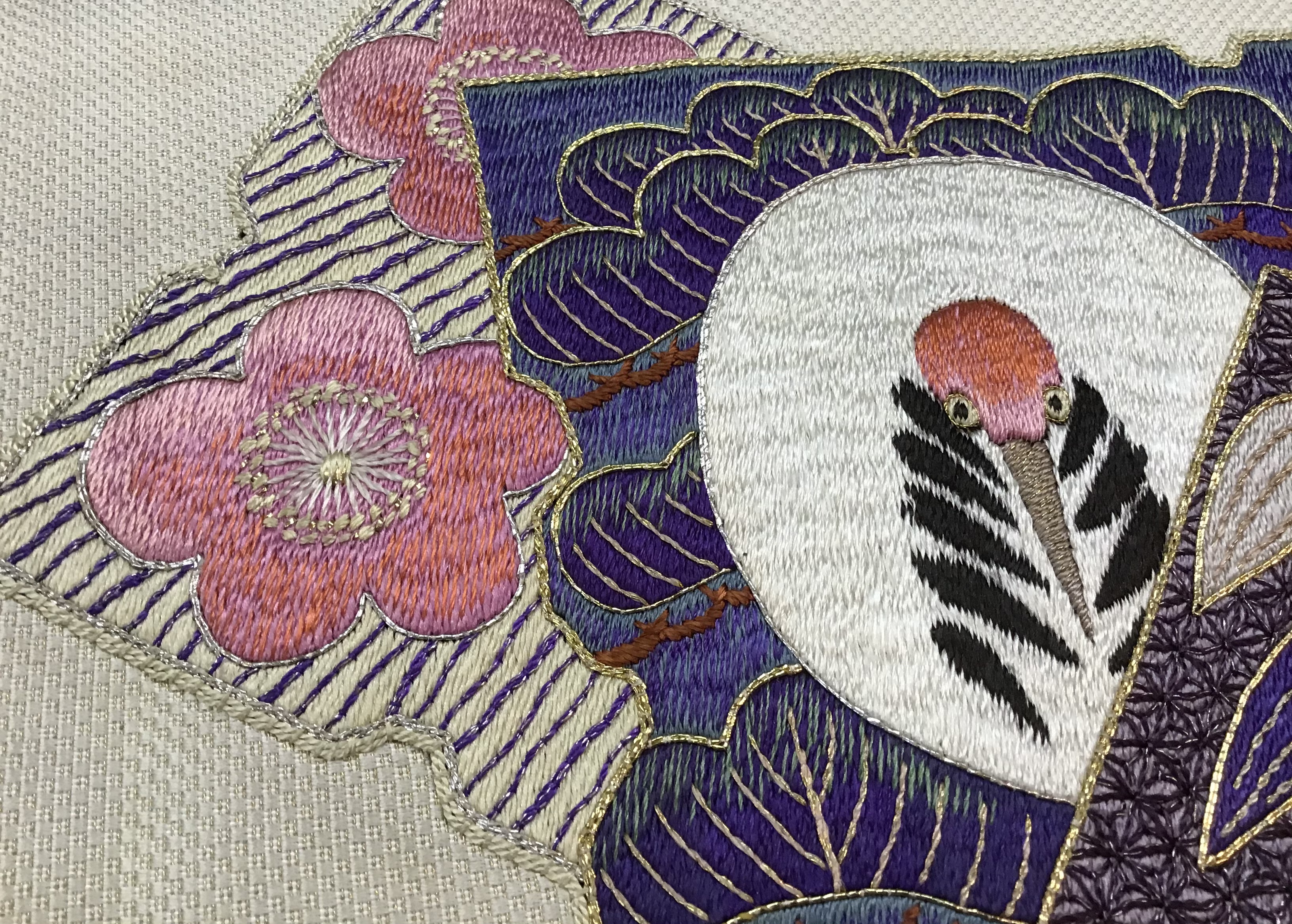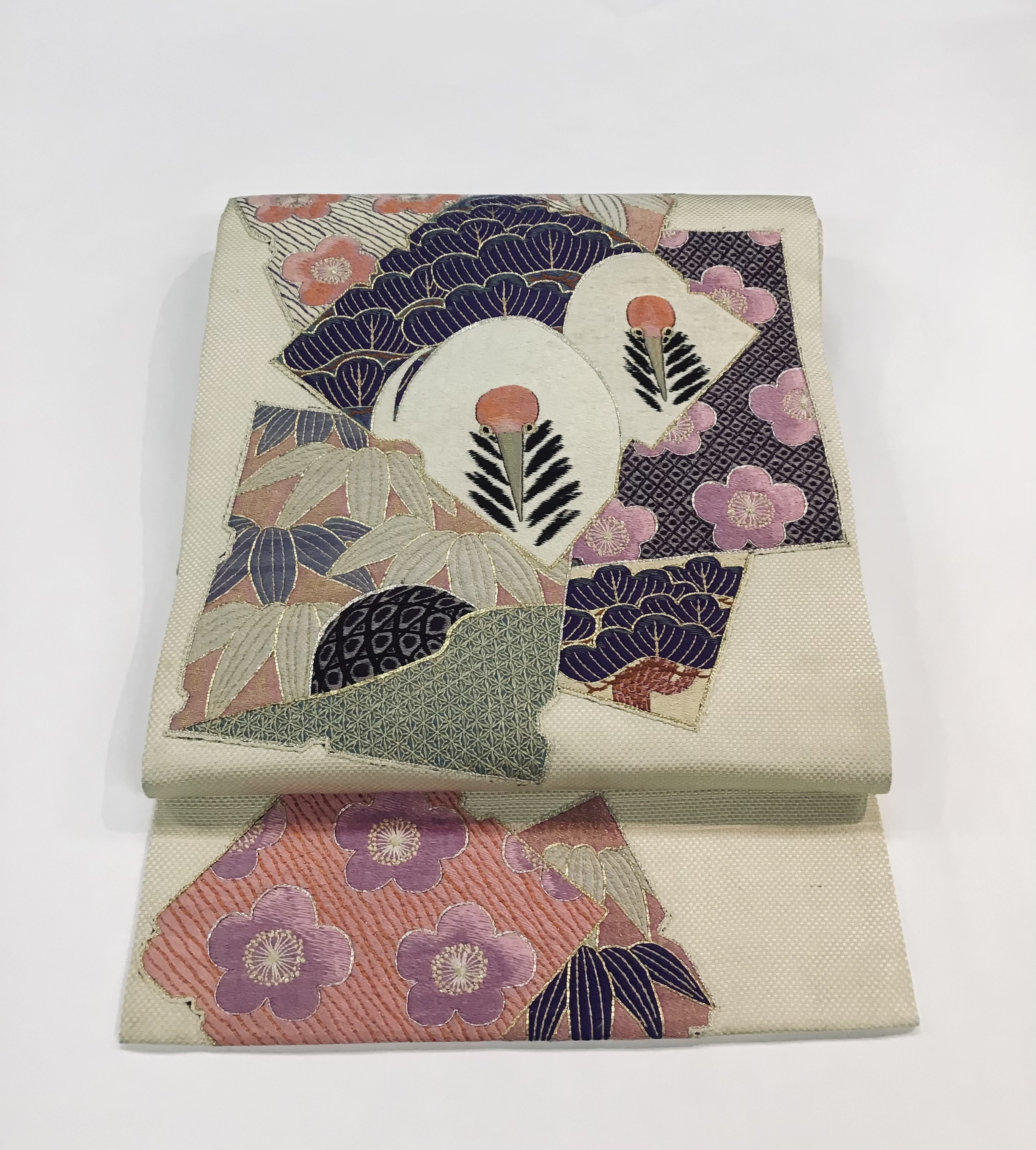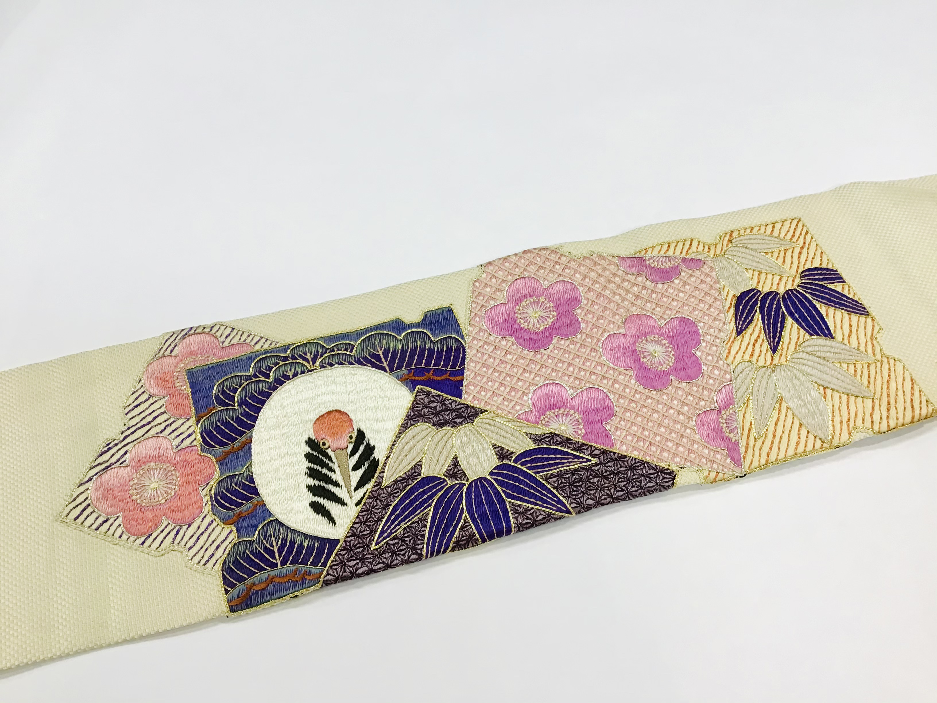 鶴と松竹梅の刺繍が丁寧に施されているお正月にぴったりの帯。