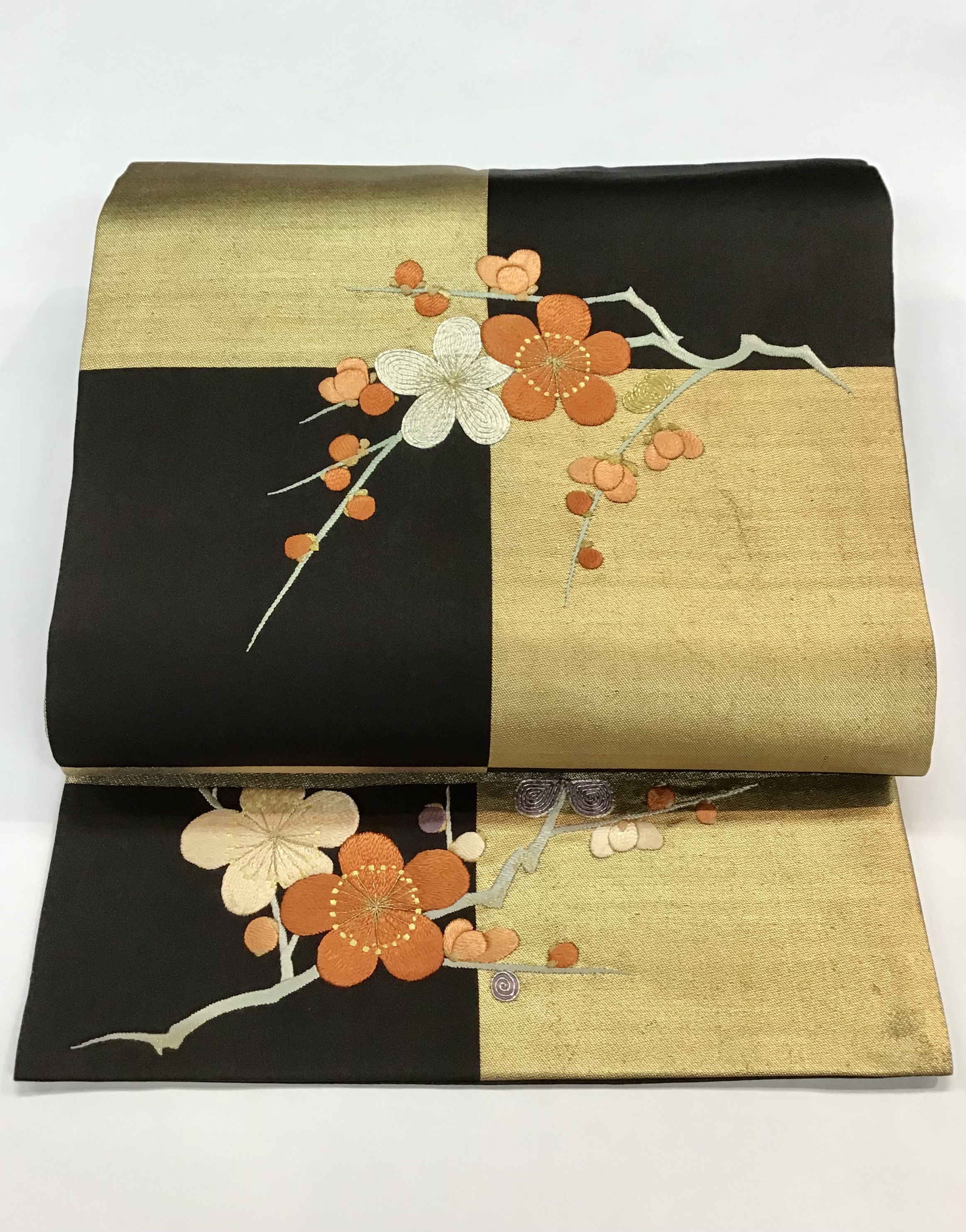 黒と金地の市松文様に朱と白の梅刺繍でおめでたく。