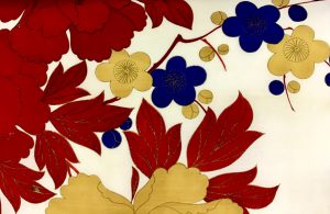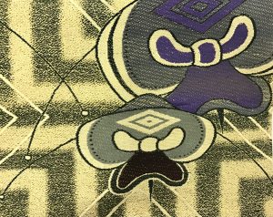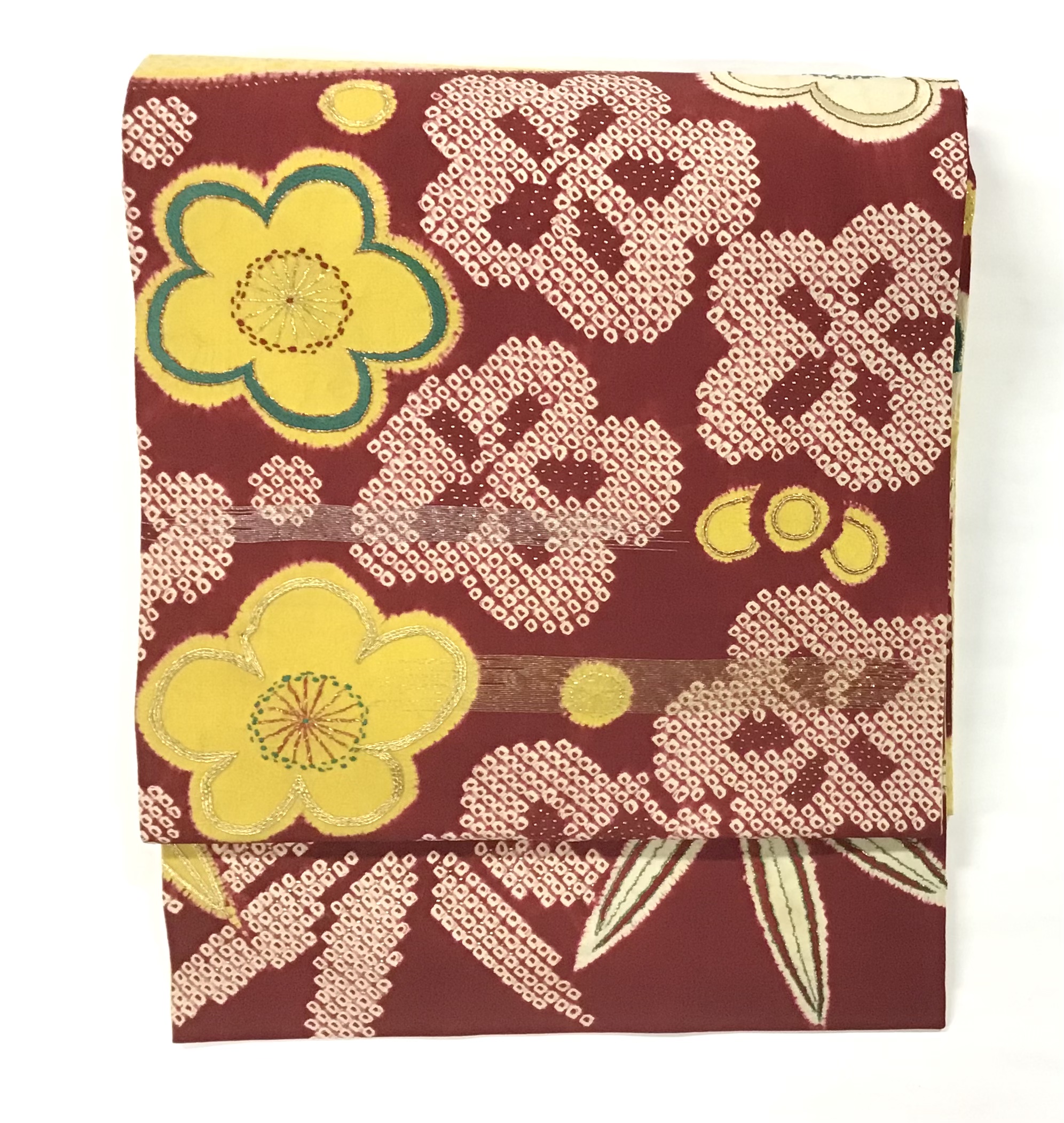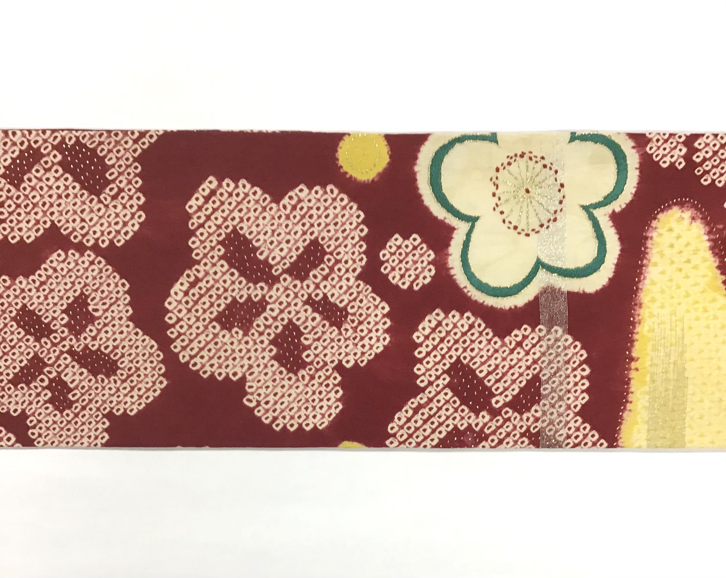 1 赤、白、黄色絞り梅と笹の名古屋帯
