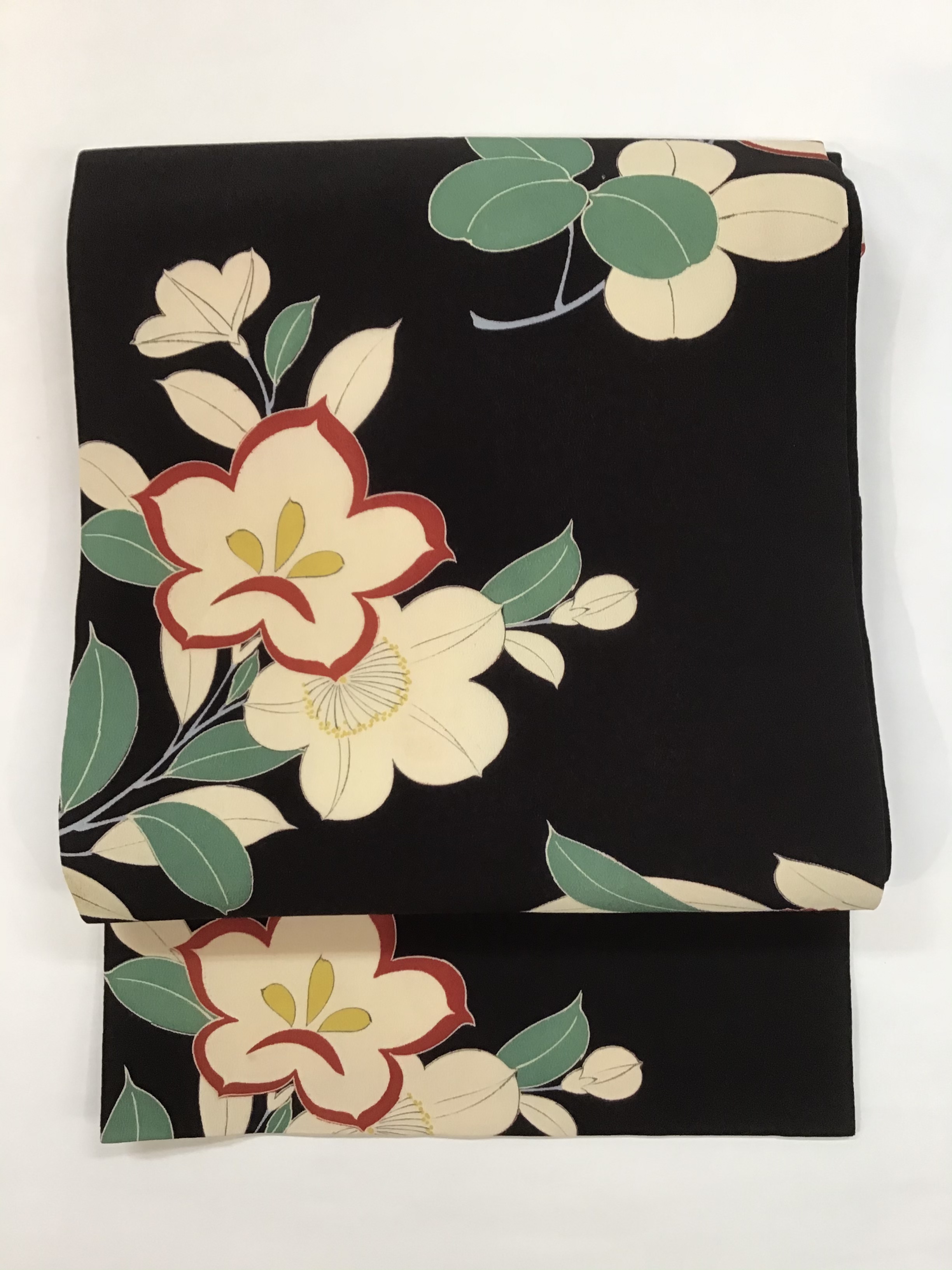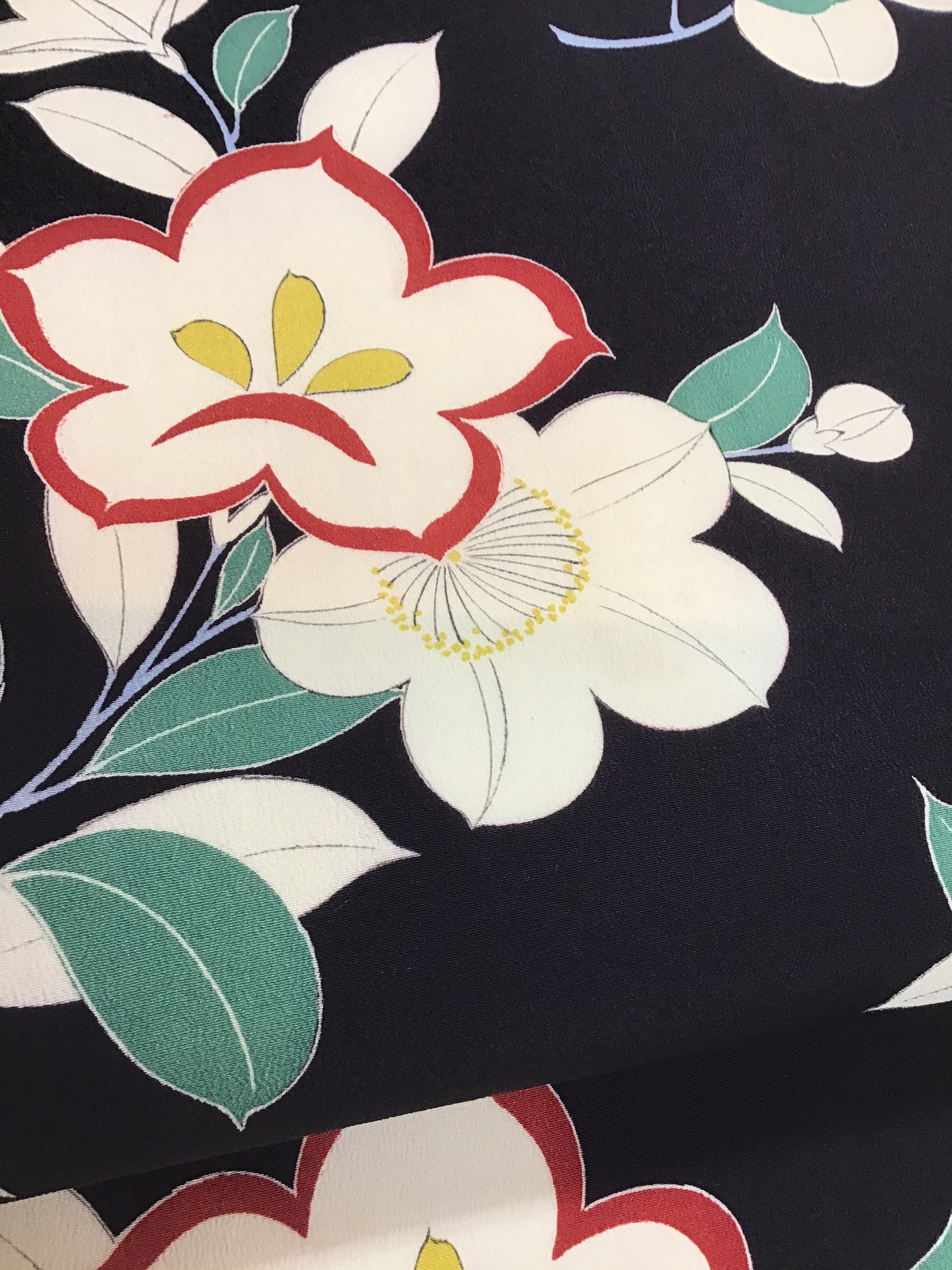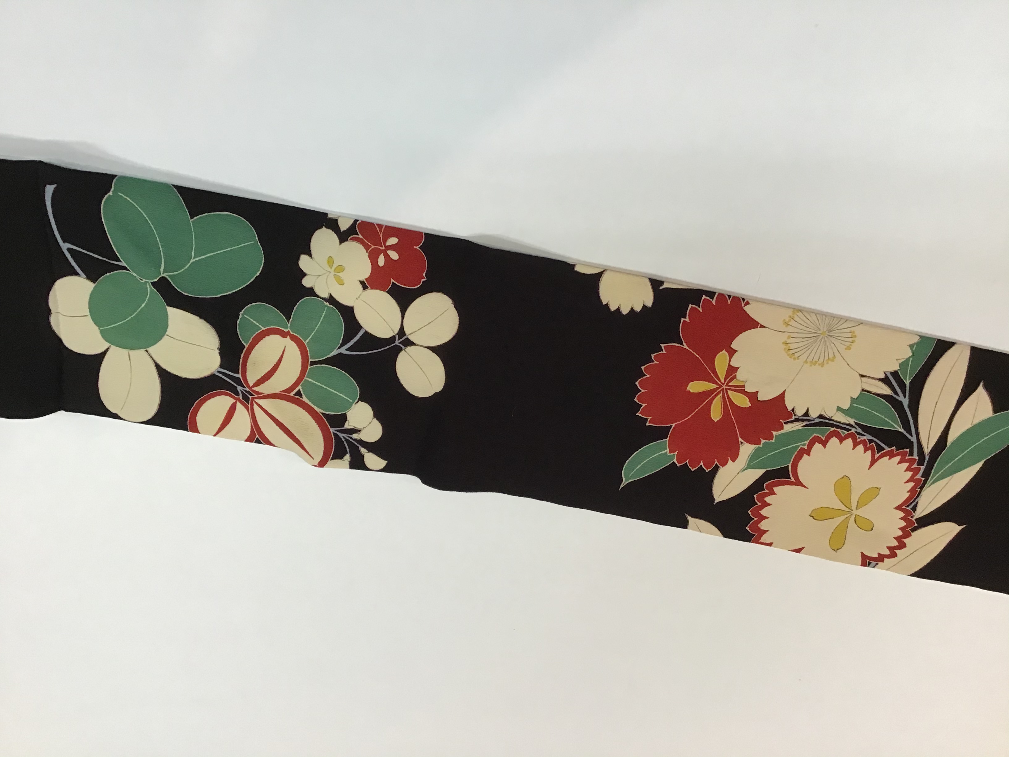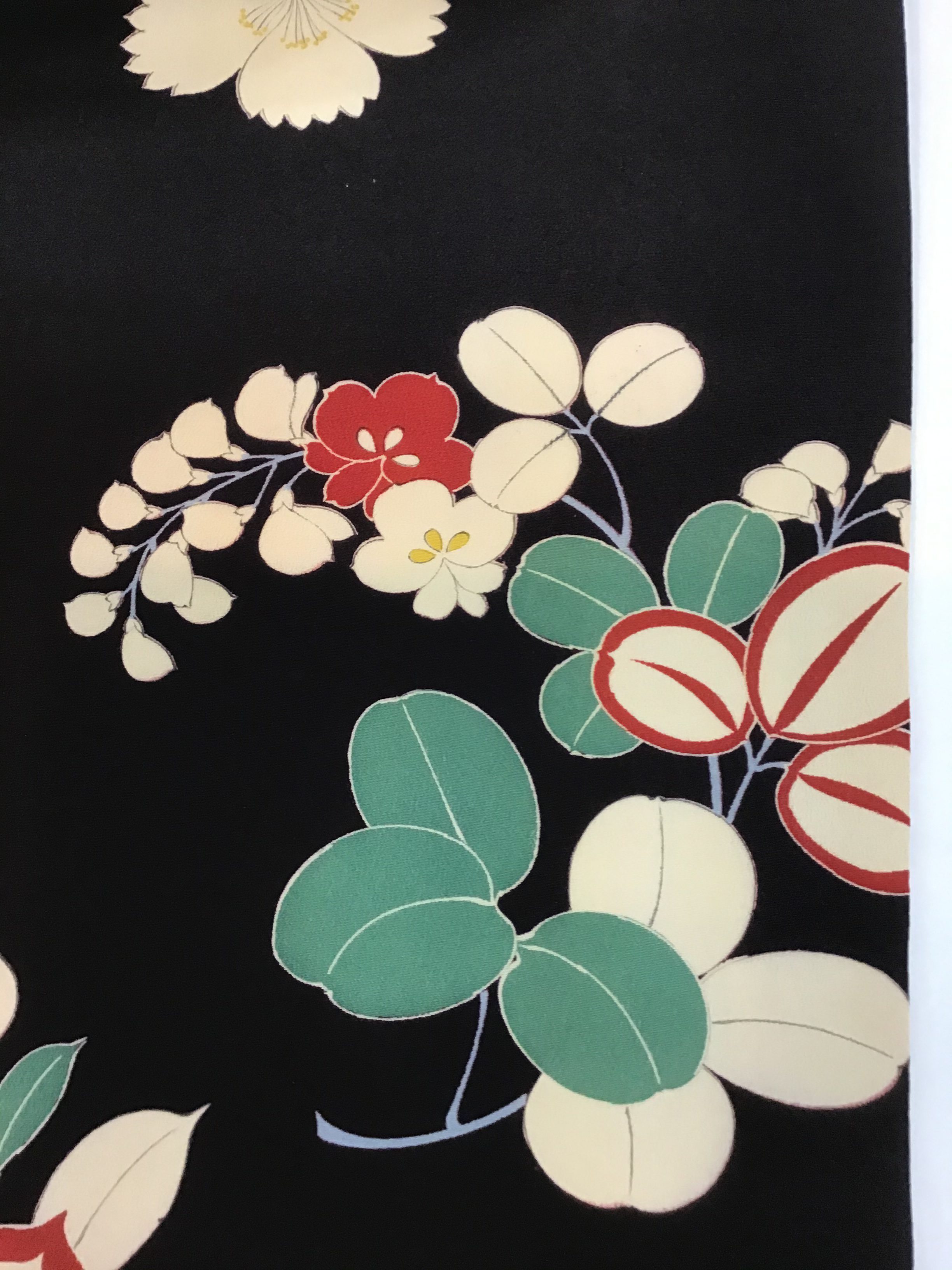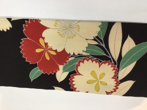 夢を彩る花達 桜と桔梗が、一緒に咲いた上手な図柄。 撫子や丸い葉の萩も咲いています。 黒地に白と赤が、映える綺麗な染めで大輪の花々が、夢の世界のようです。 季節も楽しめるようにと昔は、大胆な中にゆったりとした、遊びがあったのですね。 桜、桔梗、撫子の染め名古屋帯33,000円(税込み)