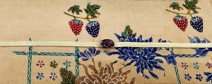 篠竹に菊、イチゴの和柄のバティック帯と紫水晶の帯留め