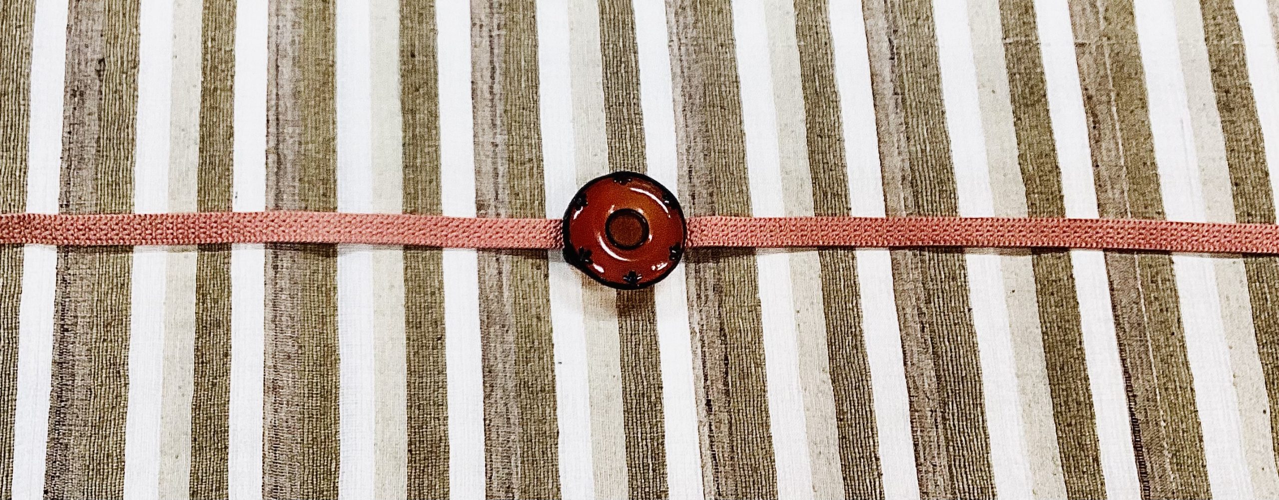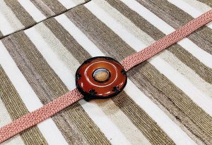 タッサーシルクの縞の帯と鼈甲に瑪瑙の鼓の帯留め