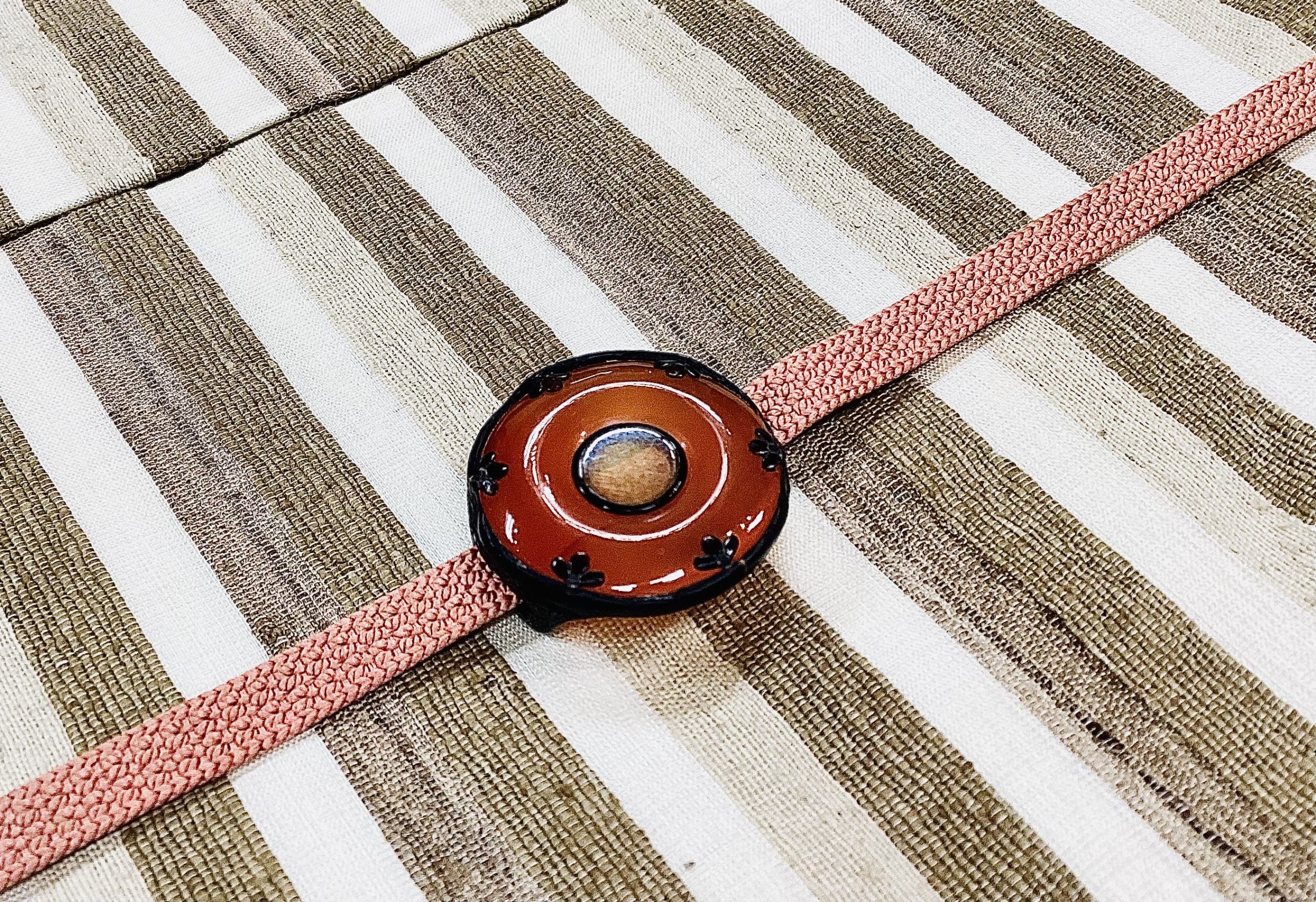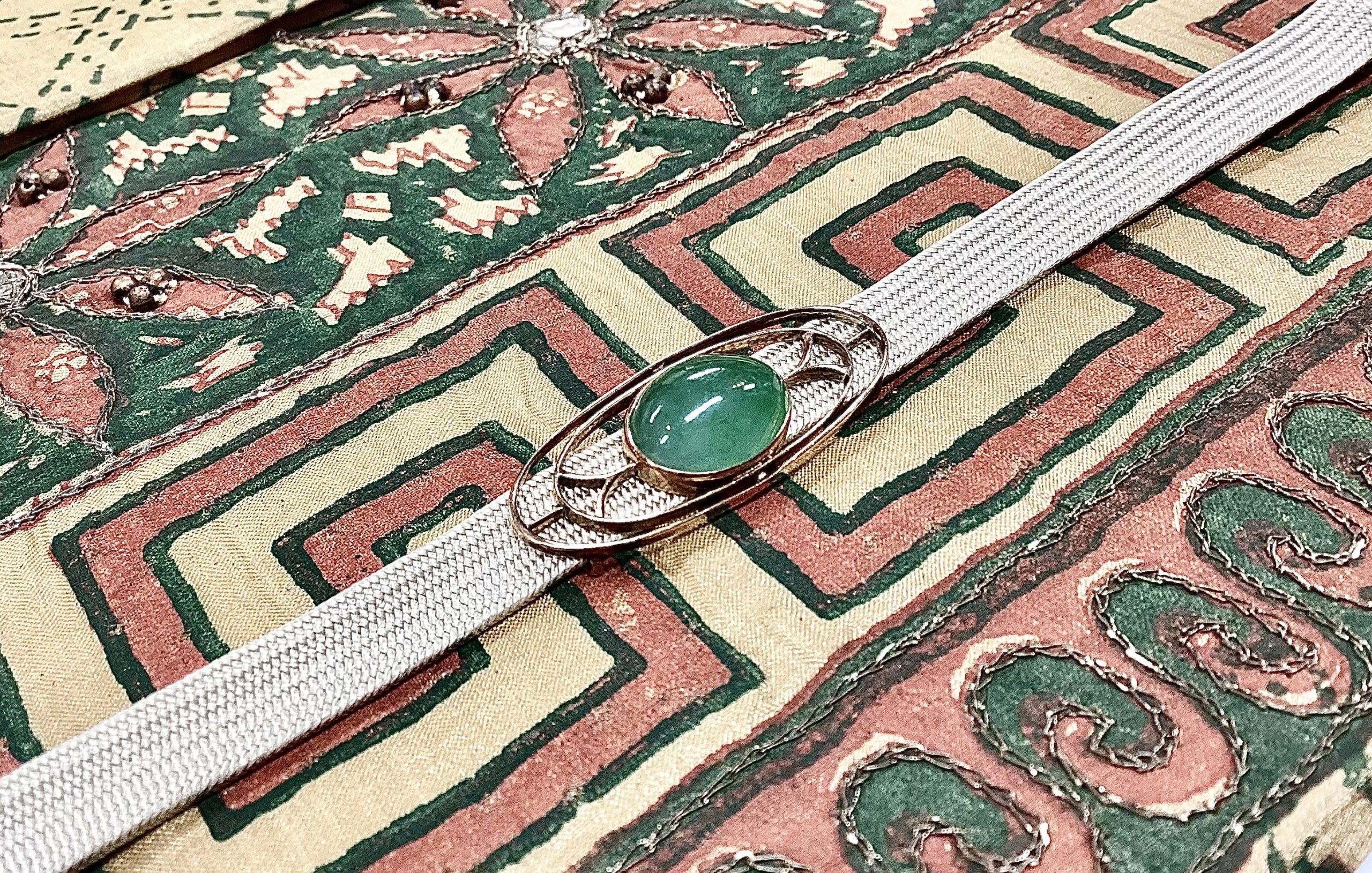 現在では厳しい社会情勢にあるアフガニスタンですが、古くから魔除けとしても用いられたミラーワークが施された、緑、赤、濃ベージュの彩り豊かな帯に金台に上質な翡翠の帯留め、思いの外映りのいい取り合わせになりました。