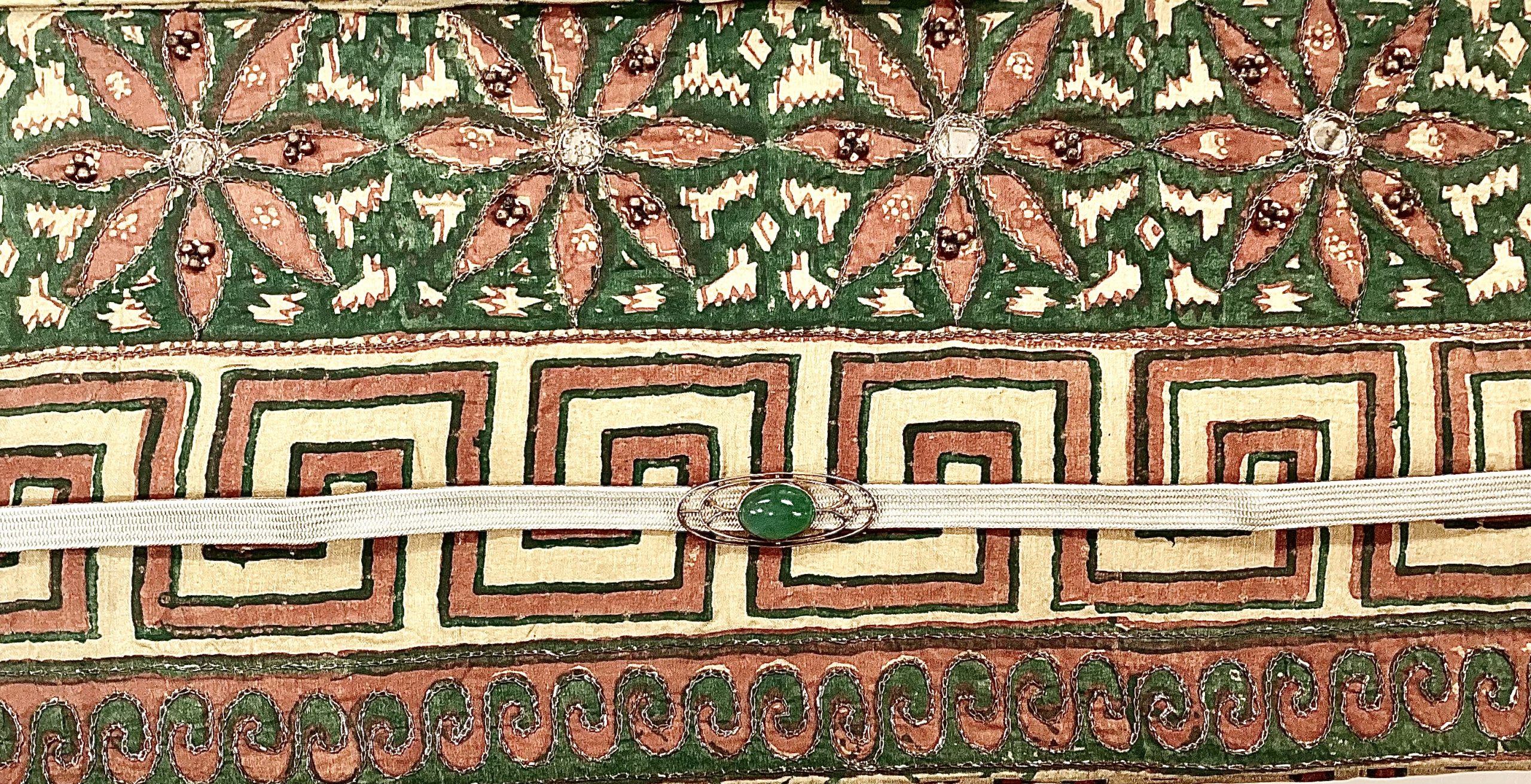 アフガニスタンミラーワークの帯140000円 金台に翡翠の帯留め47300円