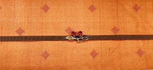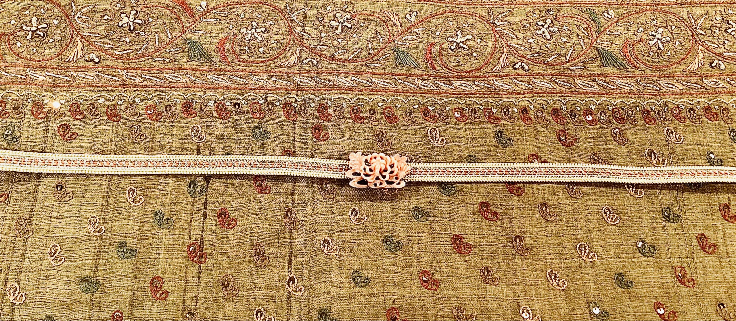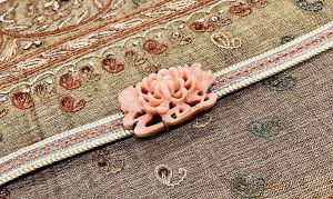 インドサリーの帯と菊の透かし彫り珊瑚の帯留め