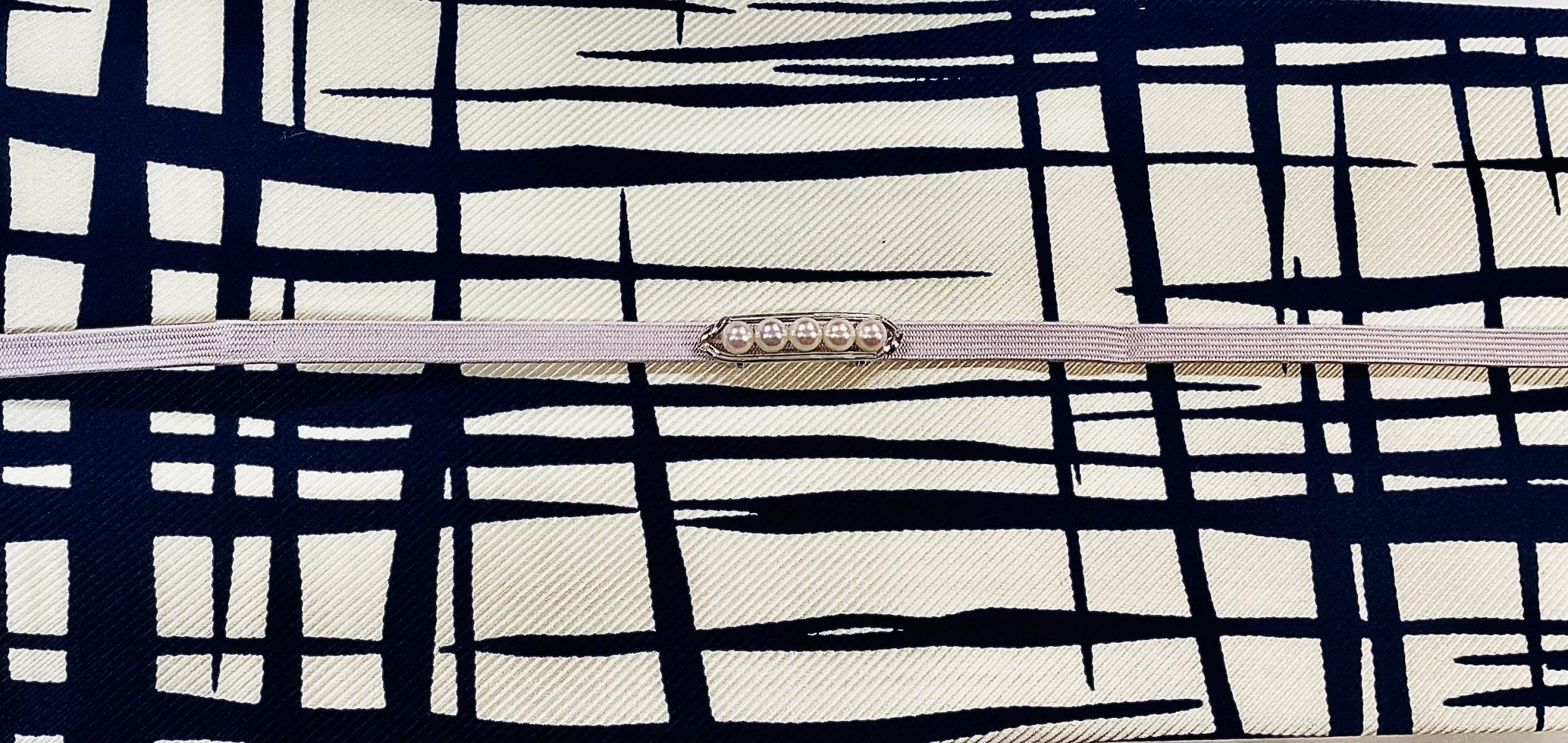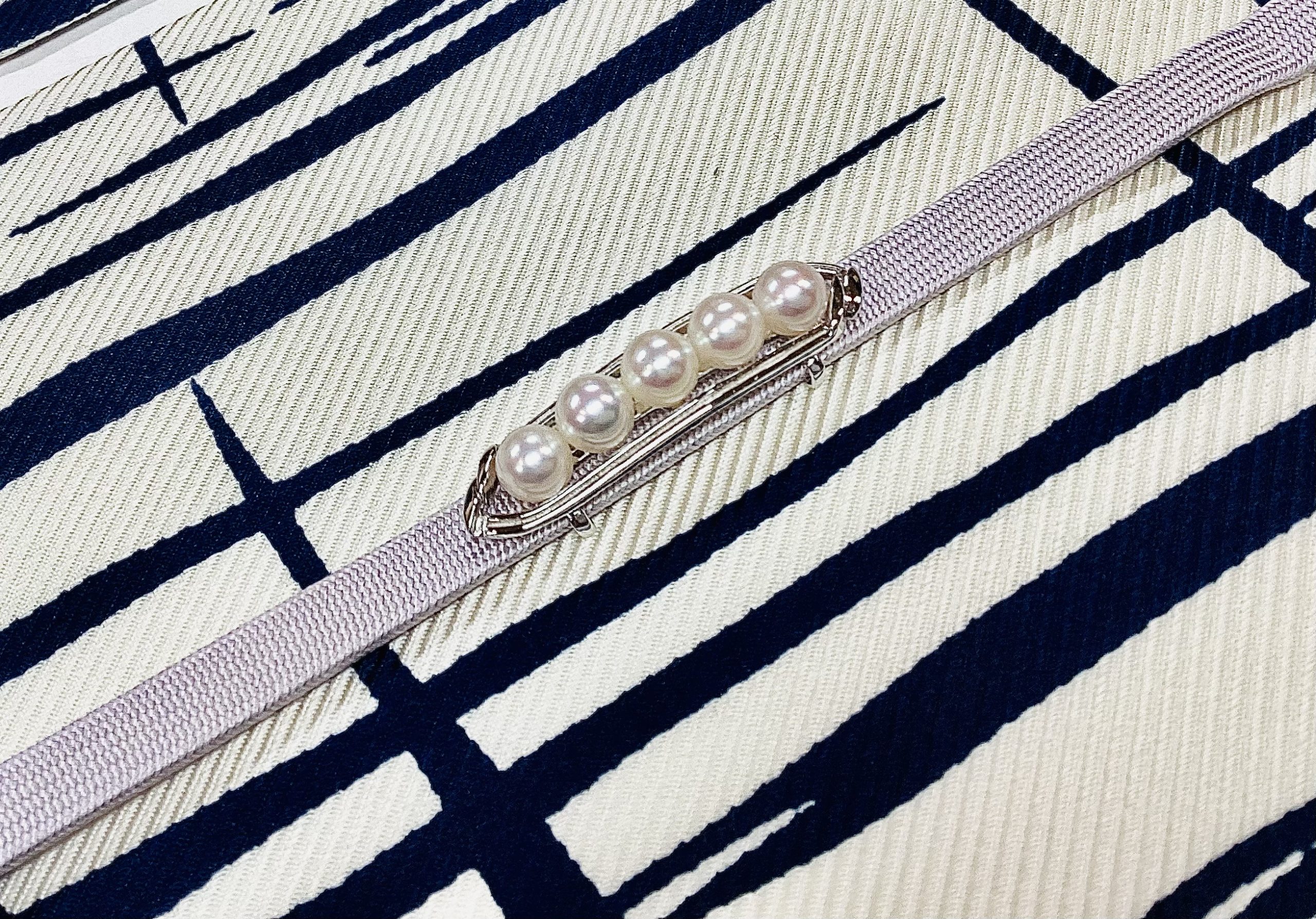 フランスリヨン木綿の帯と銀台に真珠5個を並べた帯留め