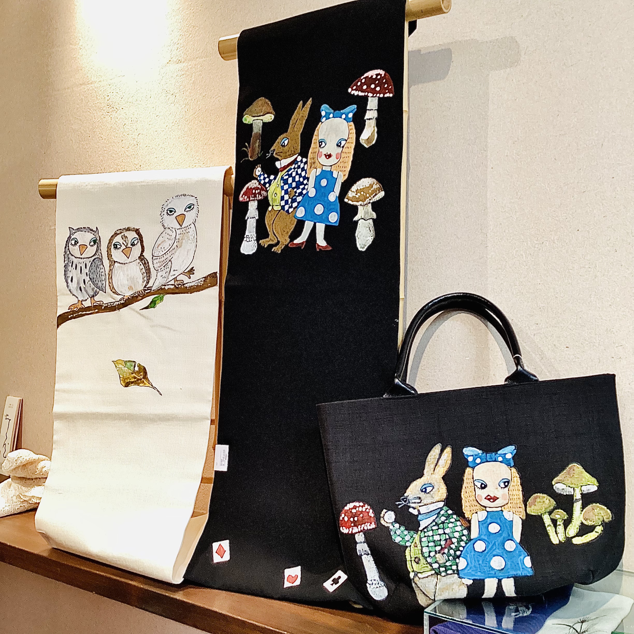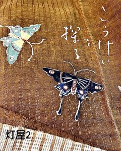 最初のお客様は、スペシャルな着物、灯屋2オリジナルの浦野理一の布による「継着物」。同じく浦野理一の無地帯でまとめていらっしゃいます!