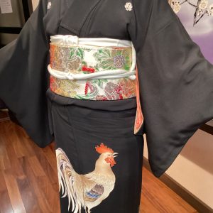 大きな鶏と雛が描かれた黒留めに、お手持ちの龍村平蔵の帯。華やかで大胆、そして個性的な装いに釘付けです!