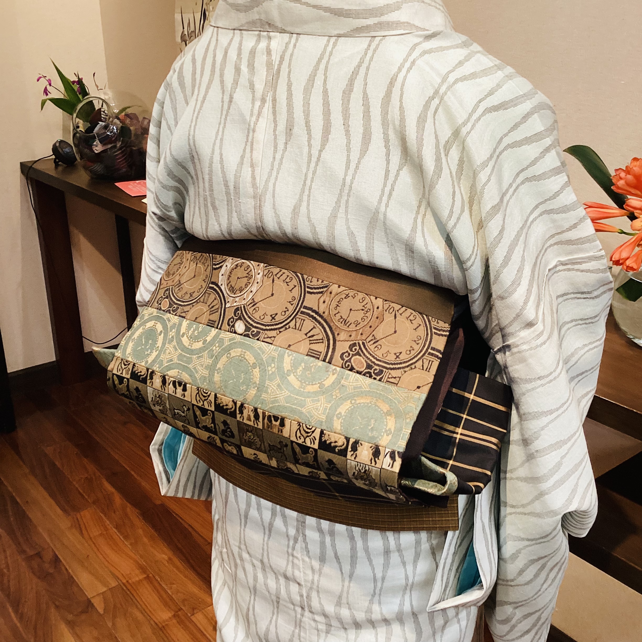 透け感の少ない夏結城に、時計模様の裂と時計に見立てた名物裂、手先は黒八丈を用いた帯。