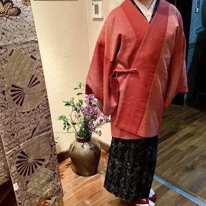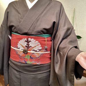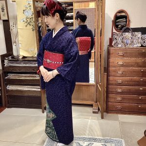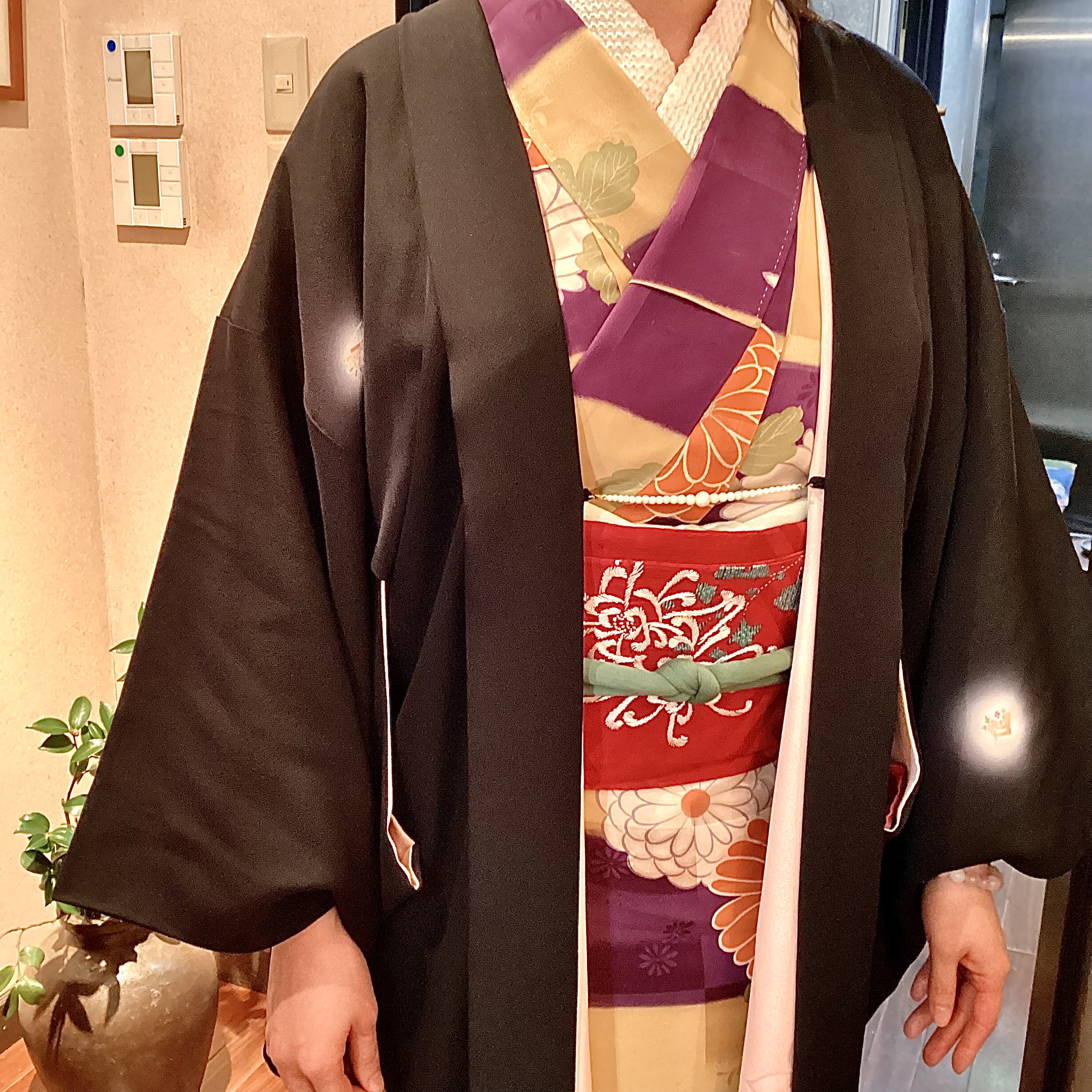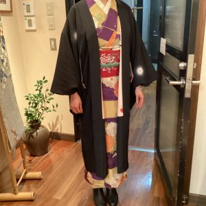次のお客様はアンティークの着物と帯を黒羽織でまとめられました。