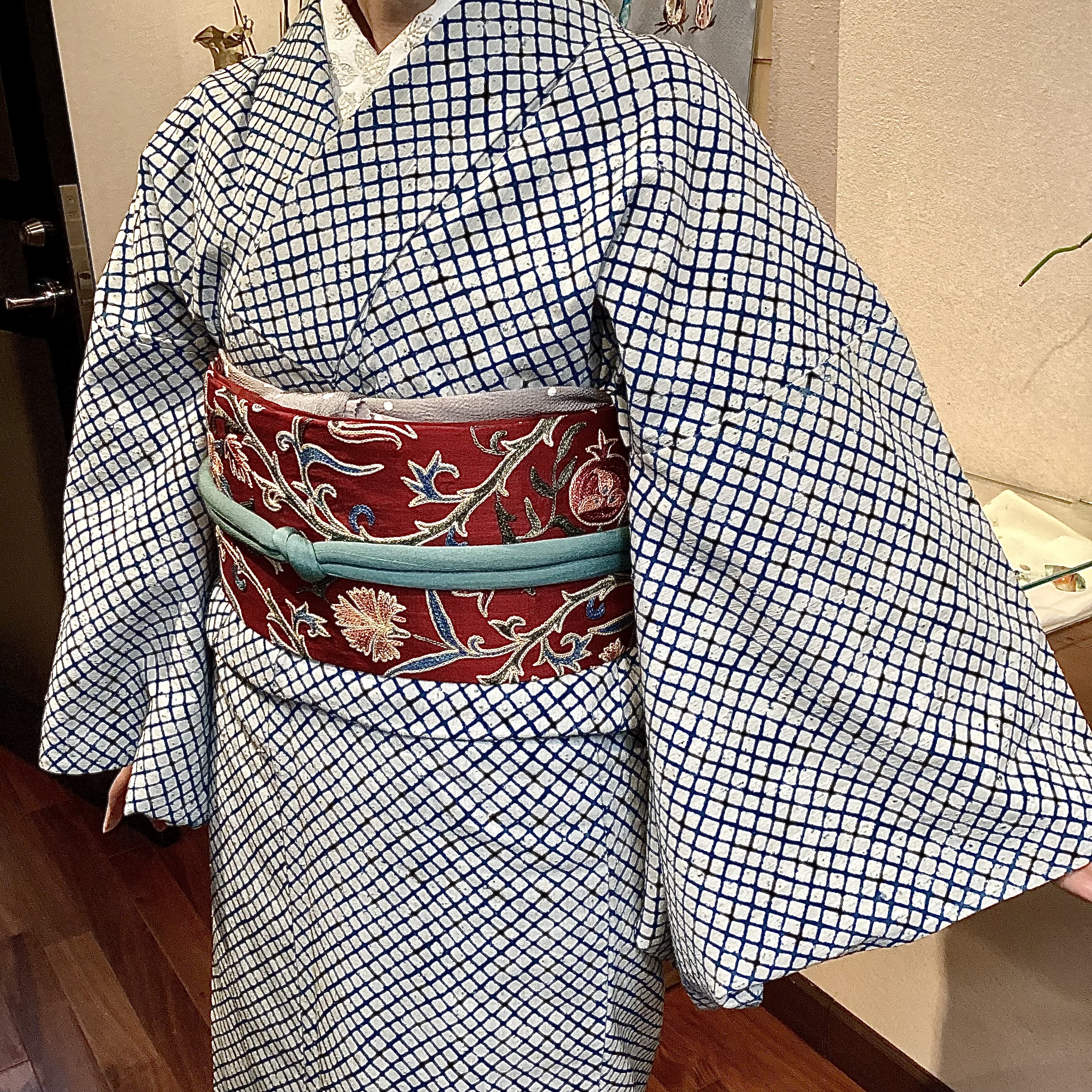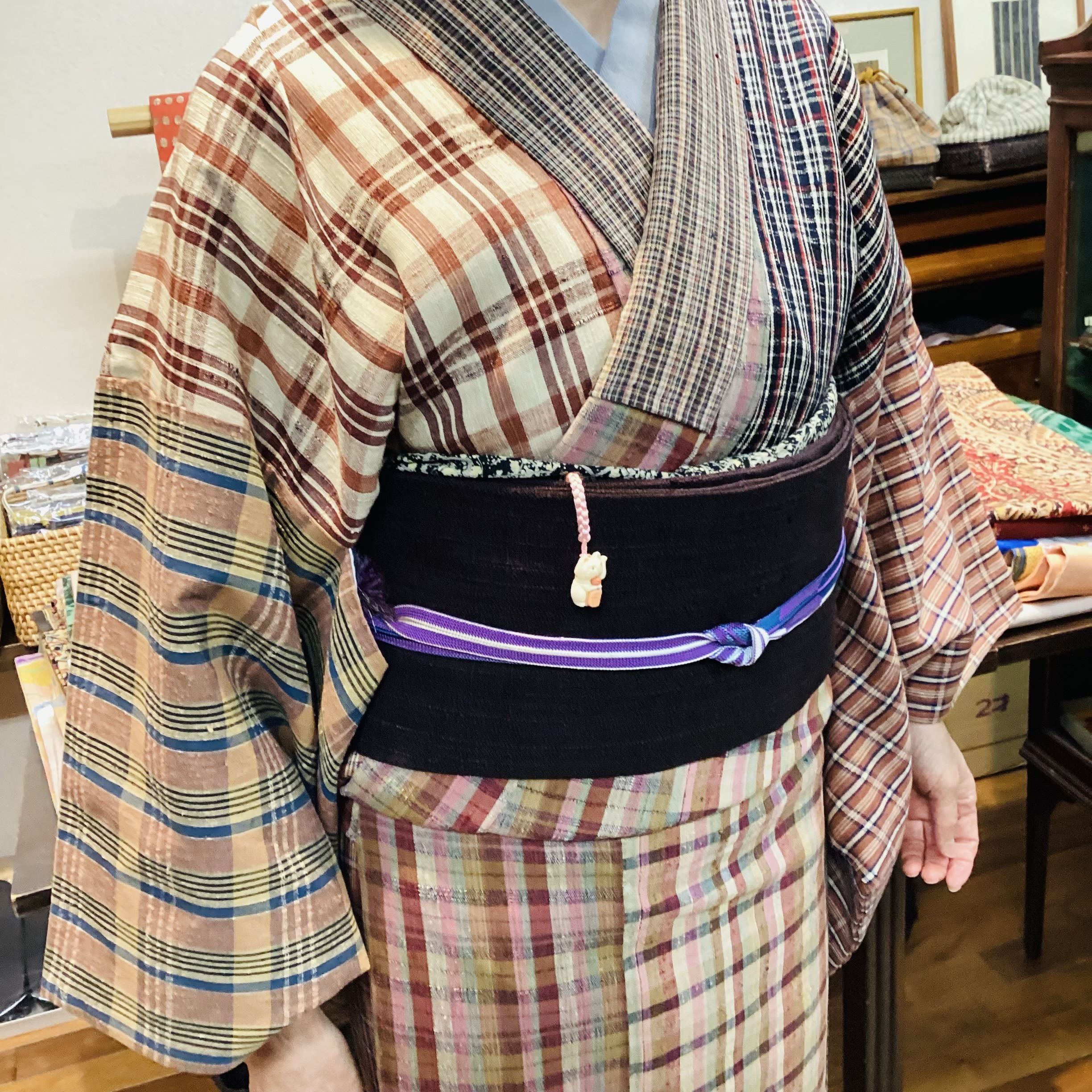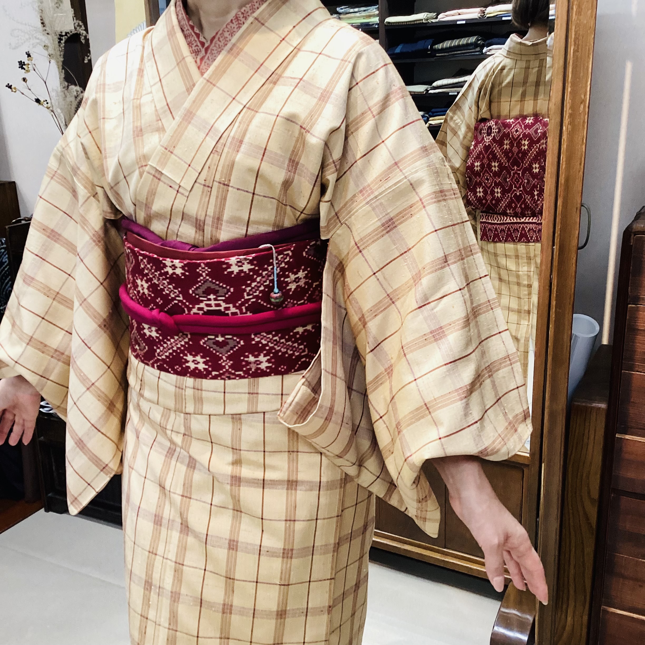 こちらのお客様は伊平織の格子の着物に、インドネシアのモール織の一種、大変貴重な布・パトラの付け帯で華やかな年末の装いのお客様。