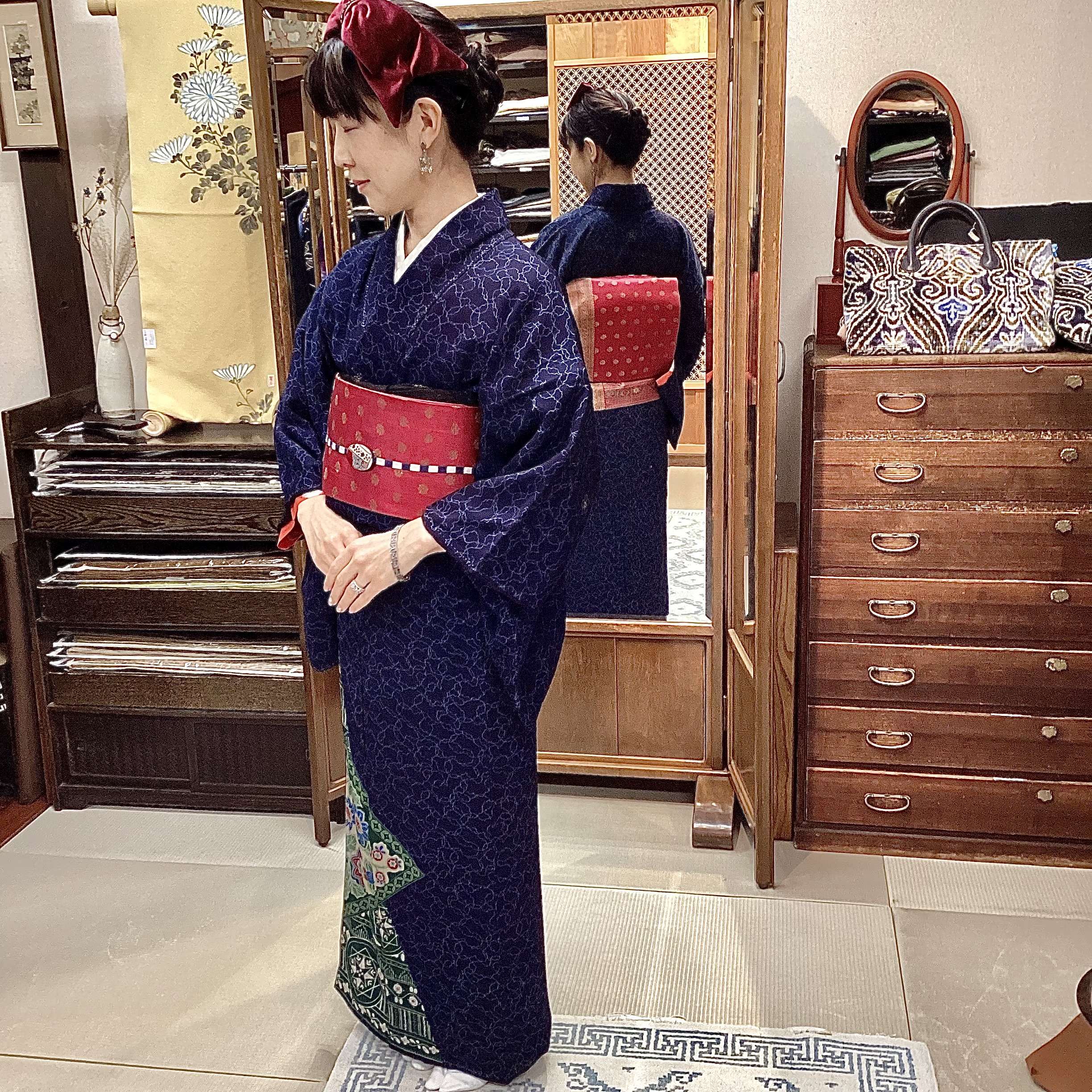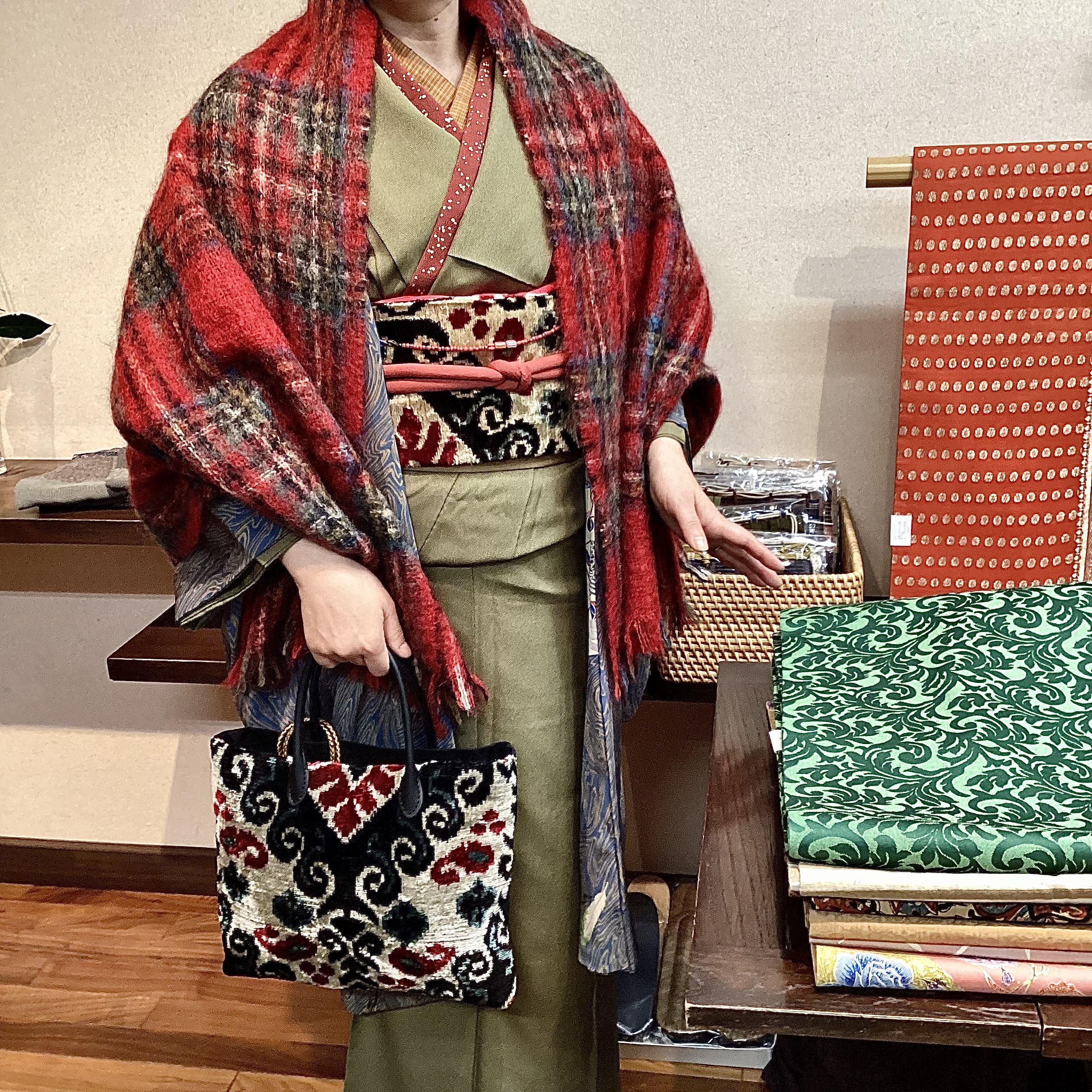 次はアドラス・ヴェルベットの帯とバッグのクリスマス・コーデのお客様!