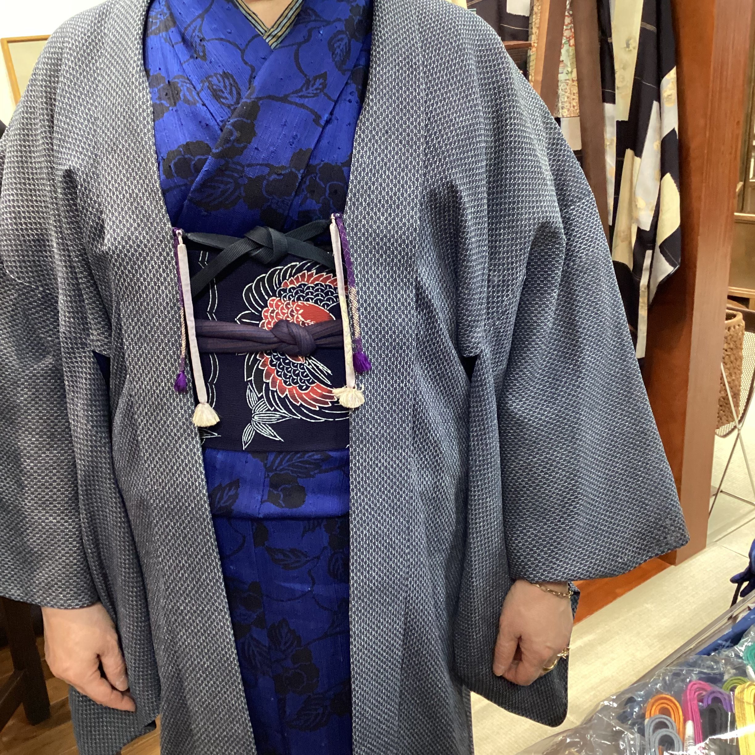 こちらは、浦野理一お着物と帯、それを灯屋2の幕末明治時代の江戸小紋の羽織でまとめていらっしゃいます。羽織紐をひと組だけと選び切れず、おしゃれとして付けているそう!
