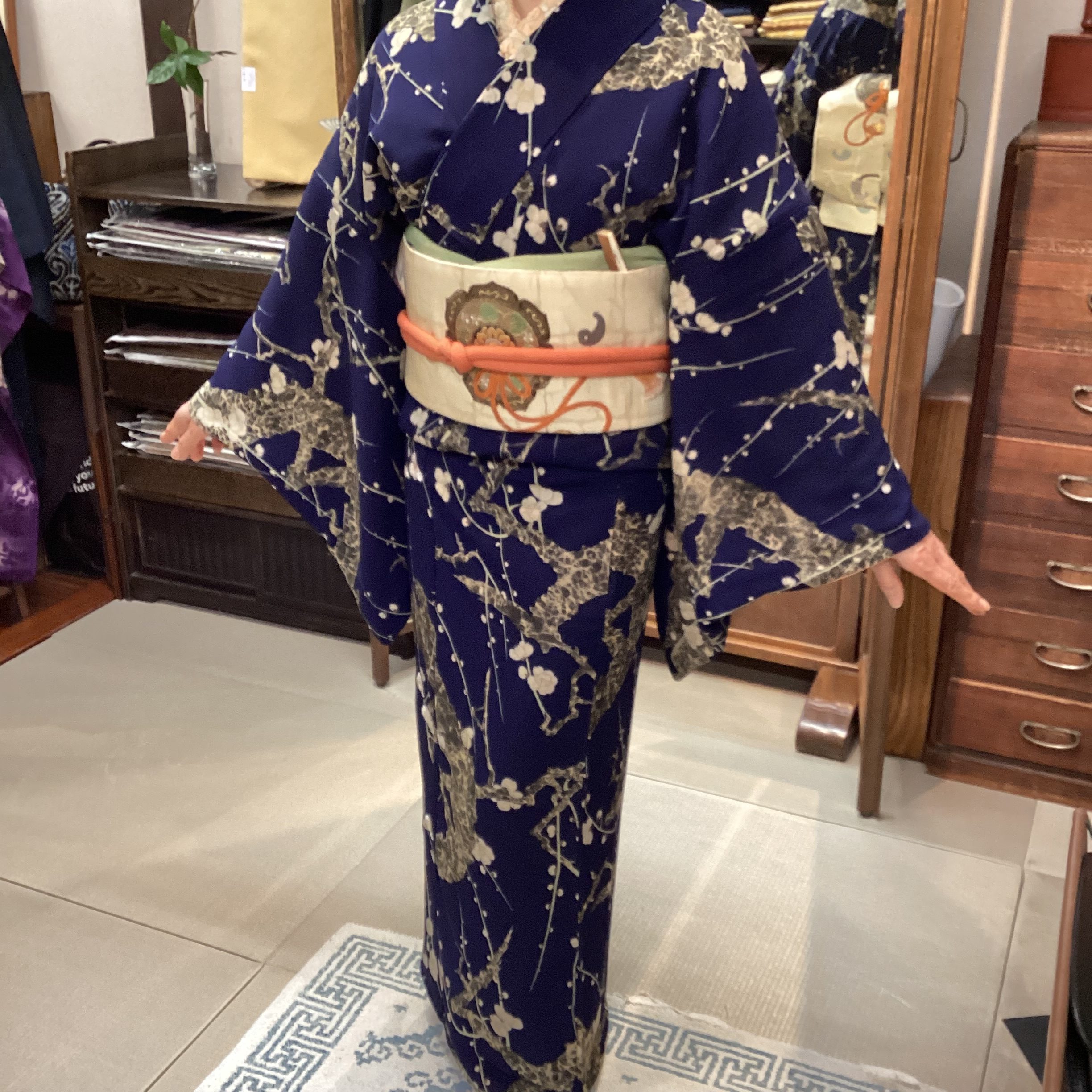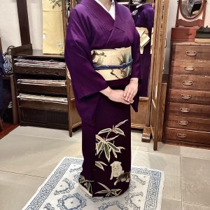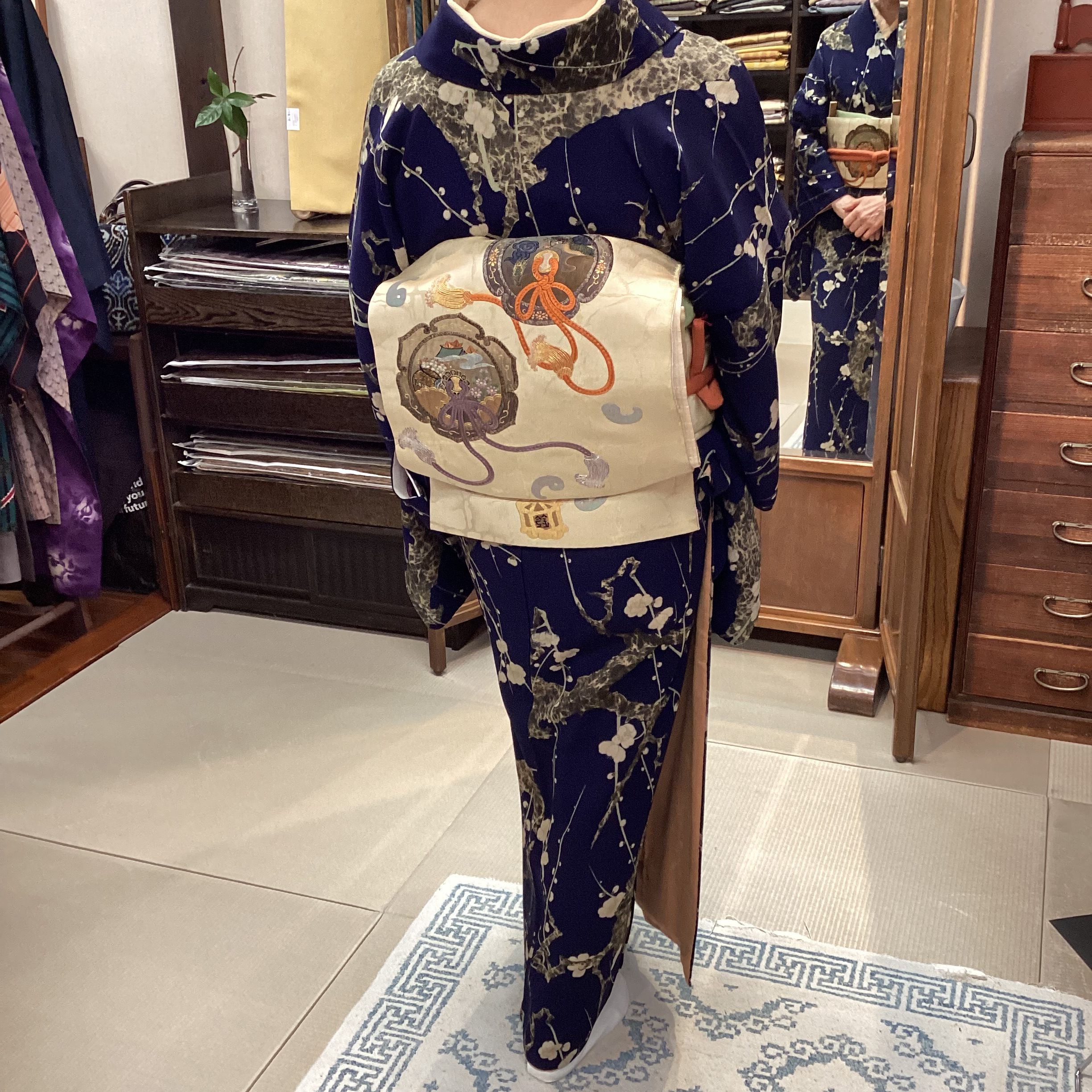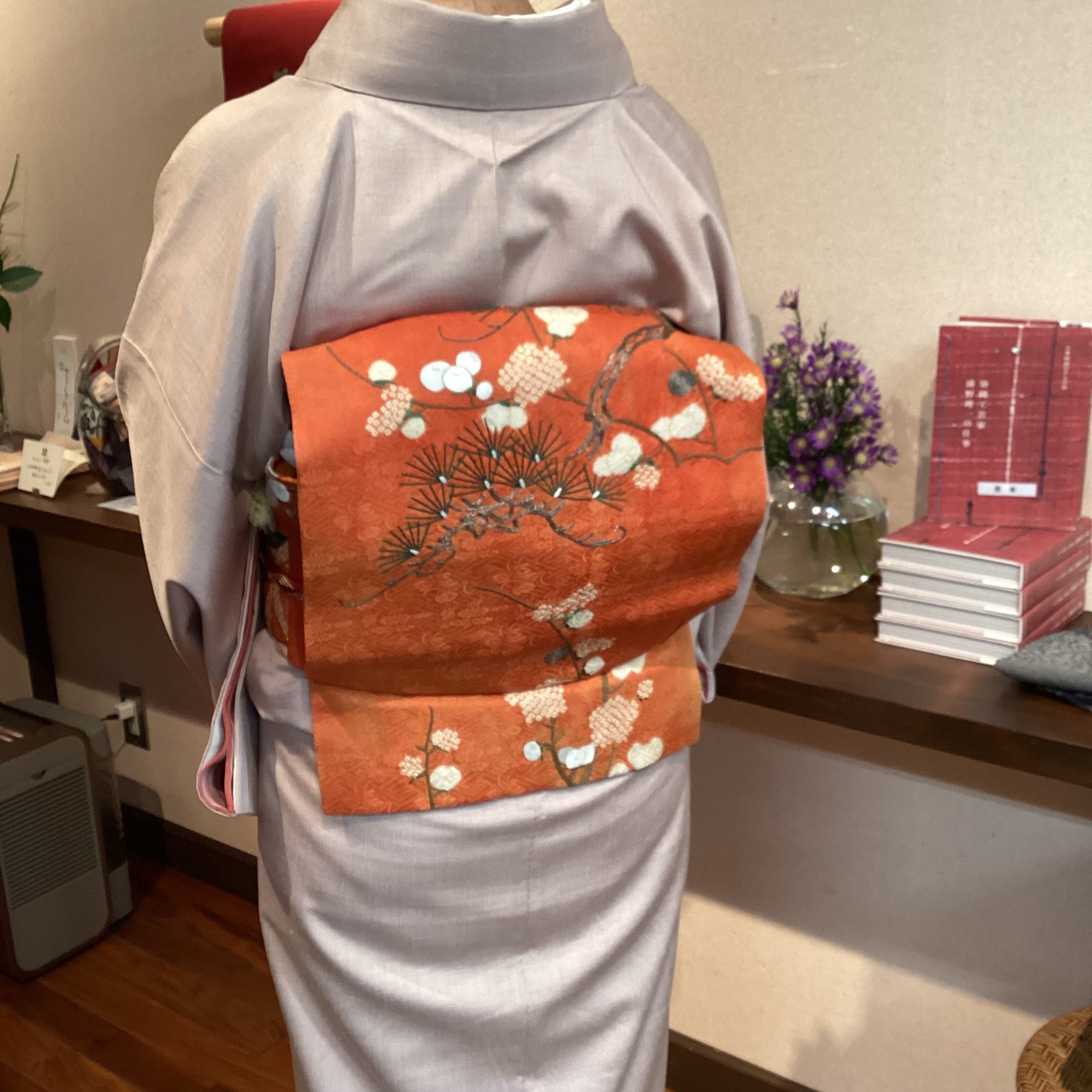 お客様の装い〜新春編2 新春もおしゃれなお支度で多くのお客様にご来店いただいています。 こちらのお客様は、優しい色合いの無地の結城に、大変貴重な紅花染の江戸裂を合わせた装い。小袖から作っています。 上品な松と梅が清々しいですね。 次のお客様は、必ずお正月にはお召しになるという訪問着。笹と戯れる犬が可愛いですね。アンティークのお着物は意匠に驚かされます。 次のお客様は、素晴らしい画風の梅のお着物に、格調高い古鏡の刺繍帯。 素敵な装いで、店内華やかに賑わいました。 ぜひ、みな様もお着物でお出かけ下さいませ。