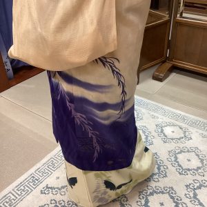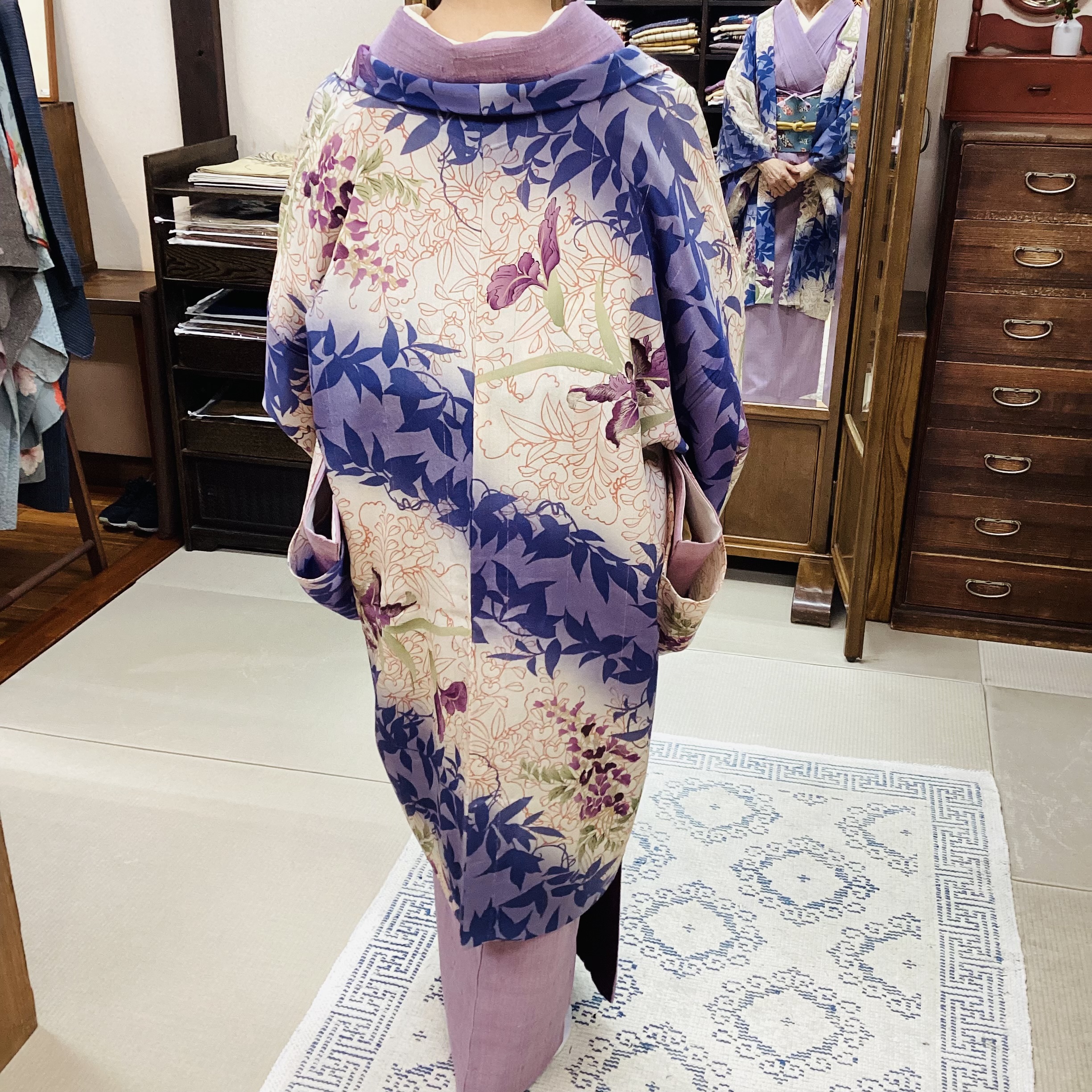 こちらのお客様は浦野理一の色無地に芹沢圭介の帯。羽織は輪郭だけ描かれた蘭の上に菖蒲が色彩鮮やかに描かれています。