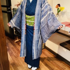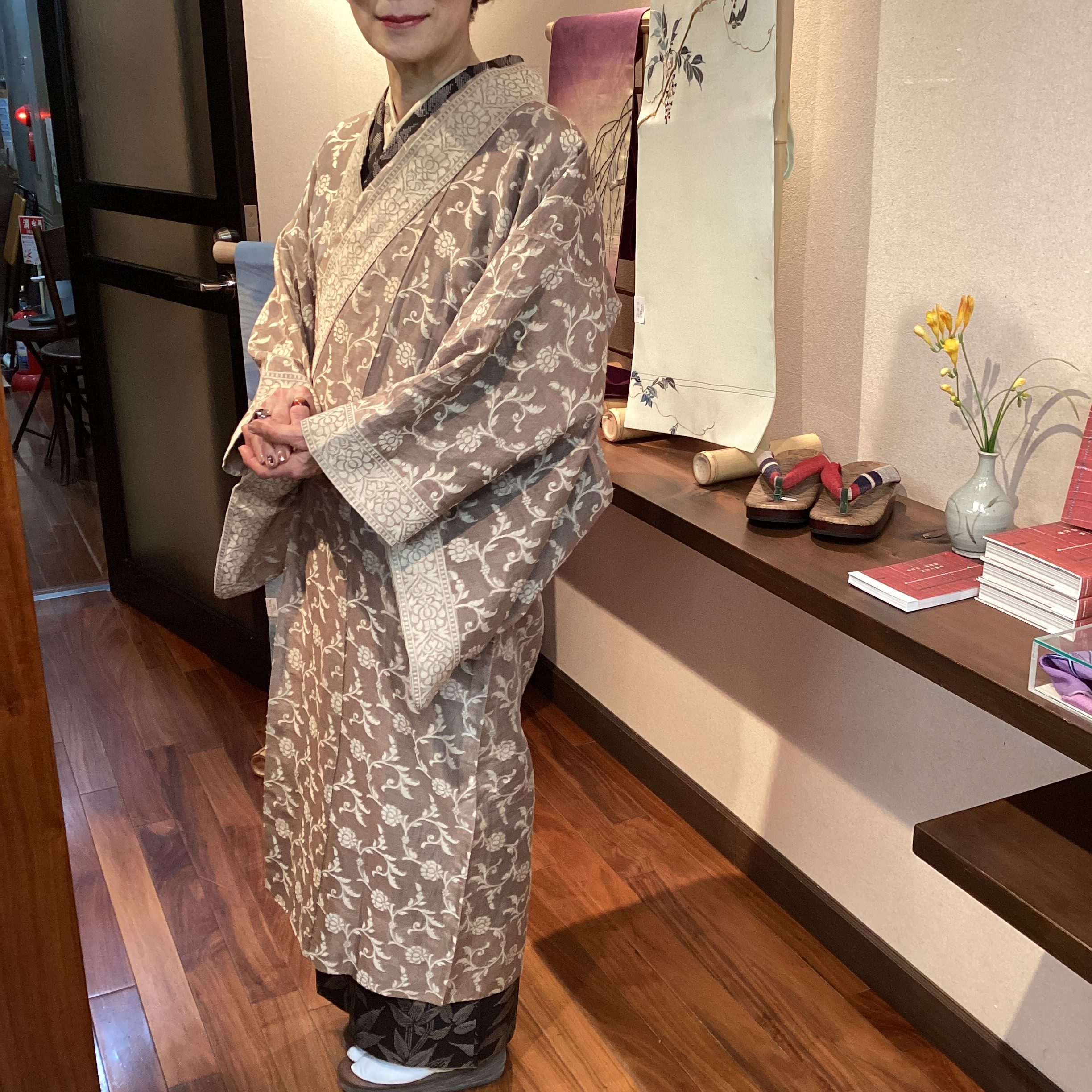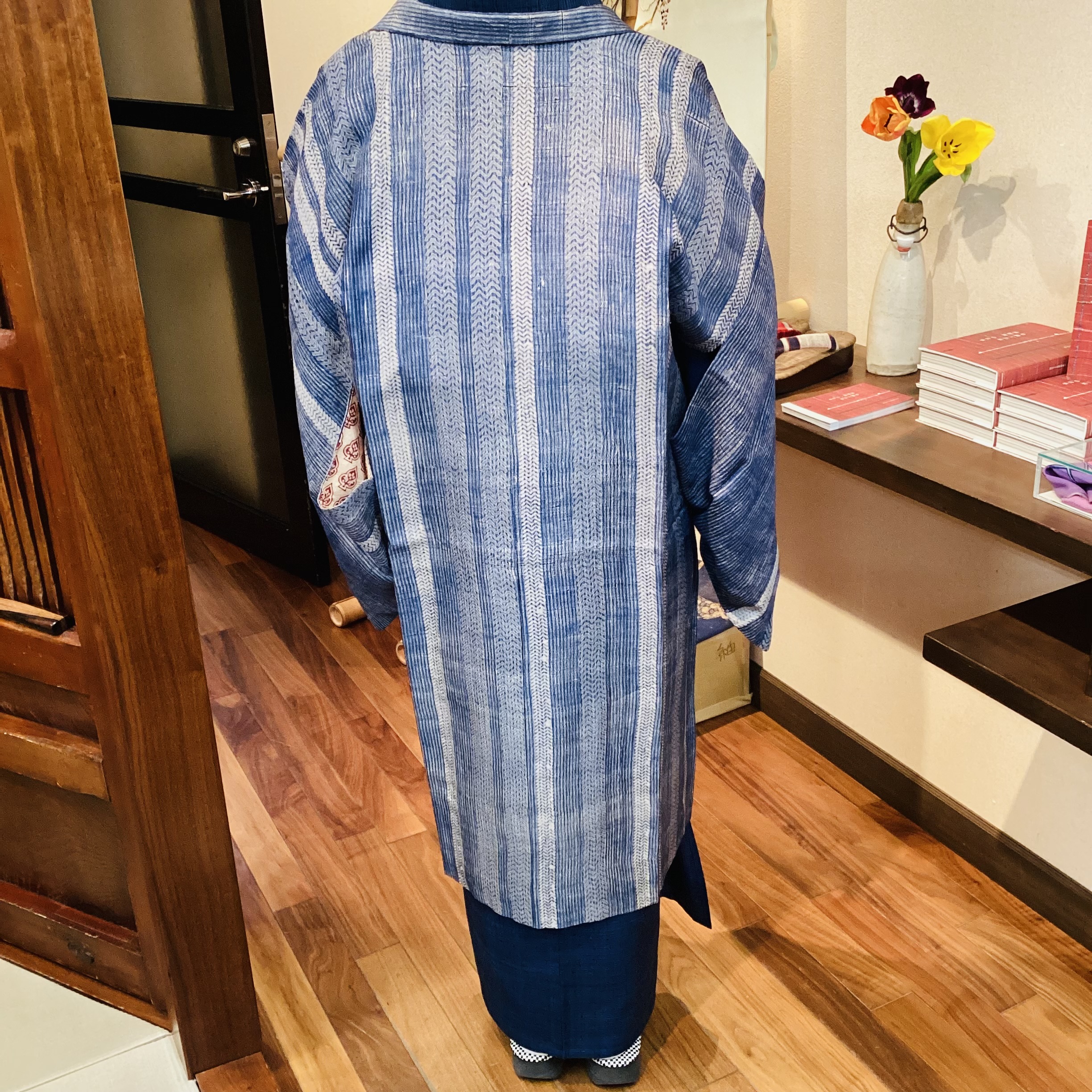 次のお客様は浦野理一の単衣の着物に、ブロック・プリントのインド・サリーの羽織。ちらっと見える羽裏もサリー。